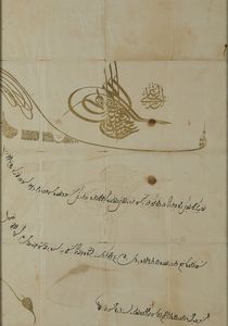 Testo in turco su carta, composto da 3 linee di testo arrangiate su colonna singola e scritte in calligrafia diwani [..]