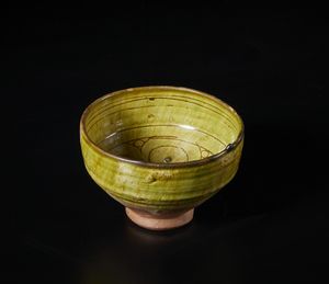 Poggiante su disco, decorata con grande fiore centrale inciso e ricoperta di vetrina verde.