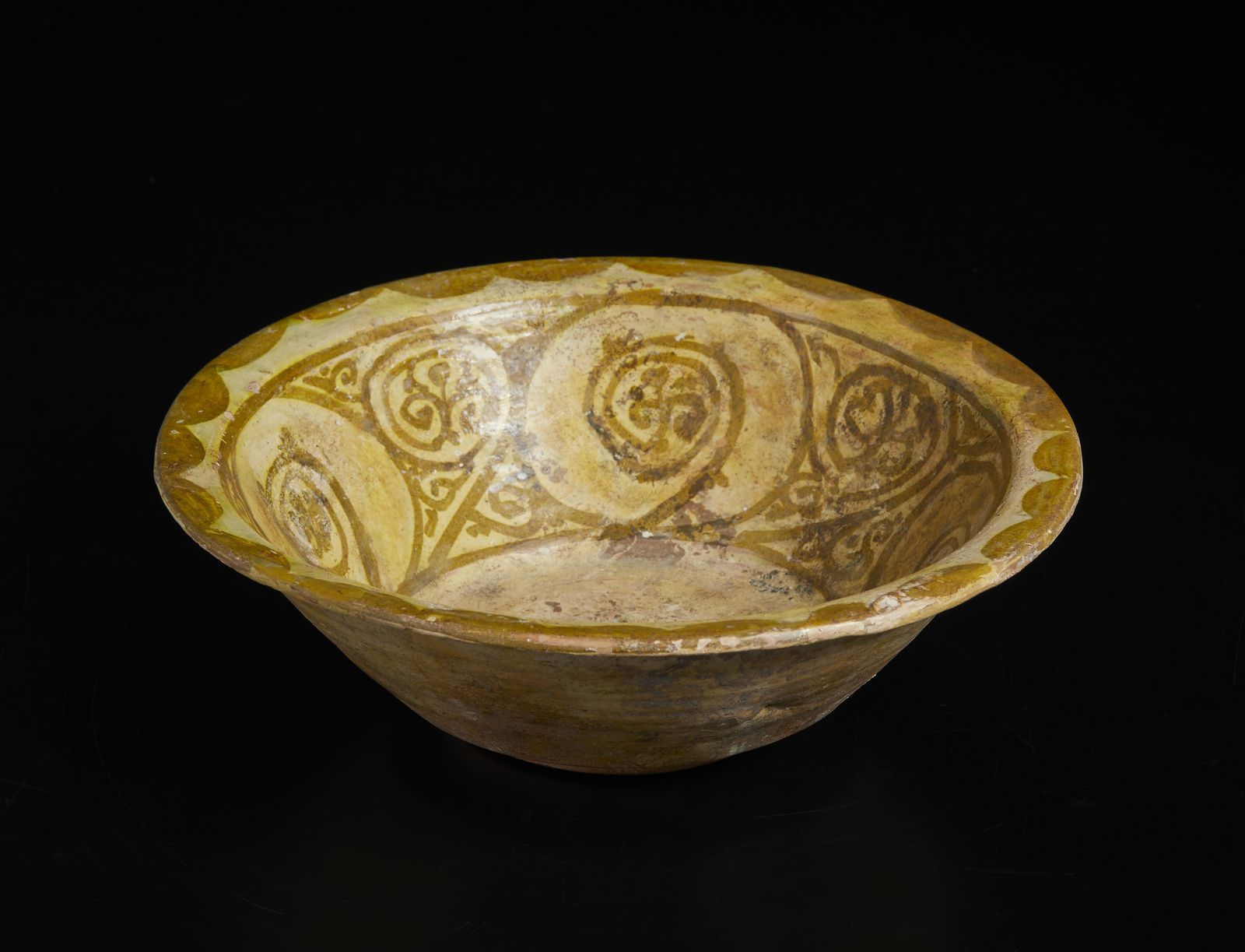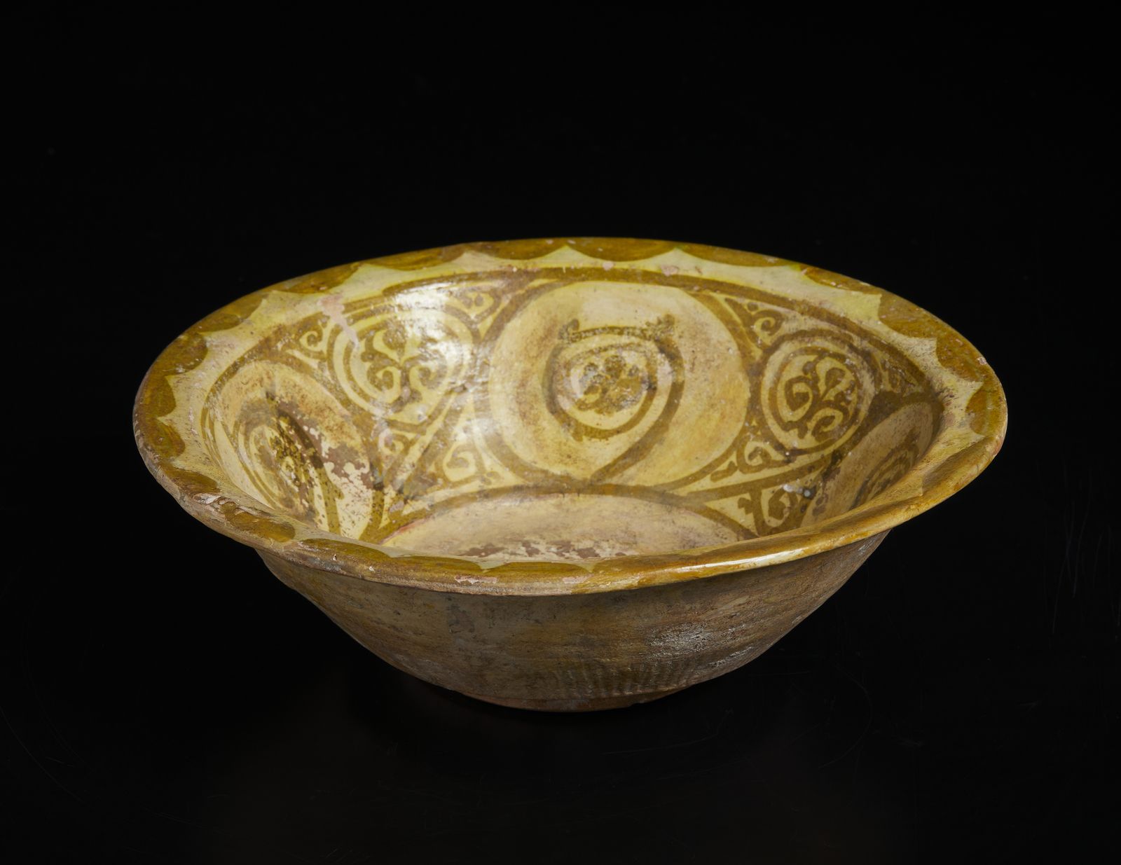Decorata ad imitazione del lustro fatimide con fascia contenente motivo floreale dipinto in verde oliva. Orlo decorato con il classico elemento ondulato.