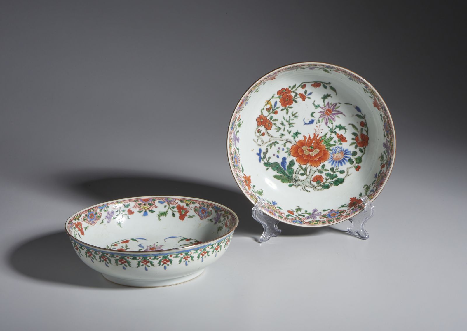 Ciotole in porcellana bianca dura sonora hanno decori in smalti fencai rilevabili al tatto. Il fondo è dipinto con un soggetto floreale. un ramo di peonia unito ad altri fiori crea un motivo continuo di foglie e piante una specie di misterioso giardino senza confini. Il bordo interno è coronato da una elaborata decorazione con riserve lobate fittamente decorate con corolle fiorite e rametti stilizzati nei toni della famiglia rosa.