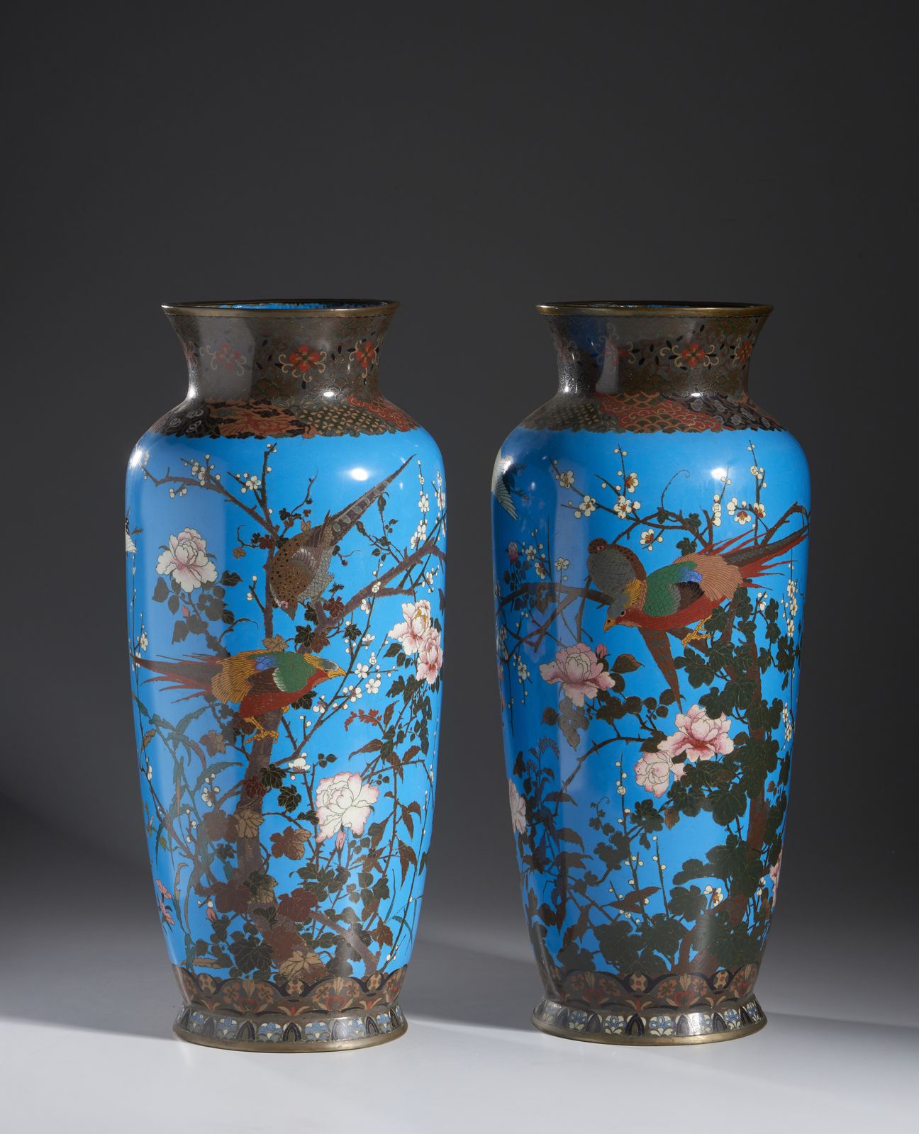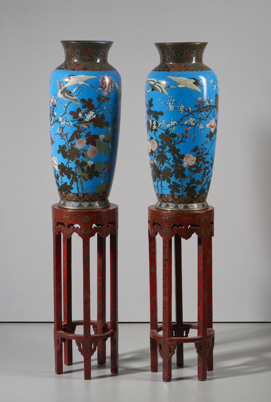 Coppia di grandi vasi in smalto cloisonné. Giappone, Periodo Meiji.