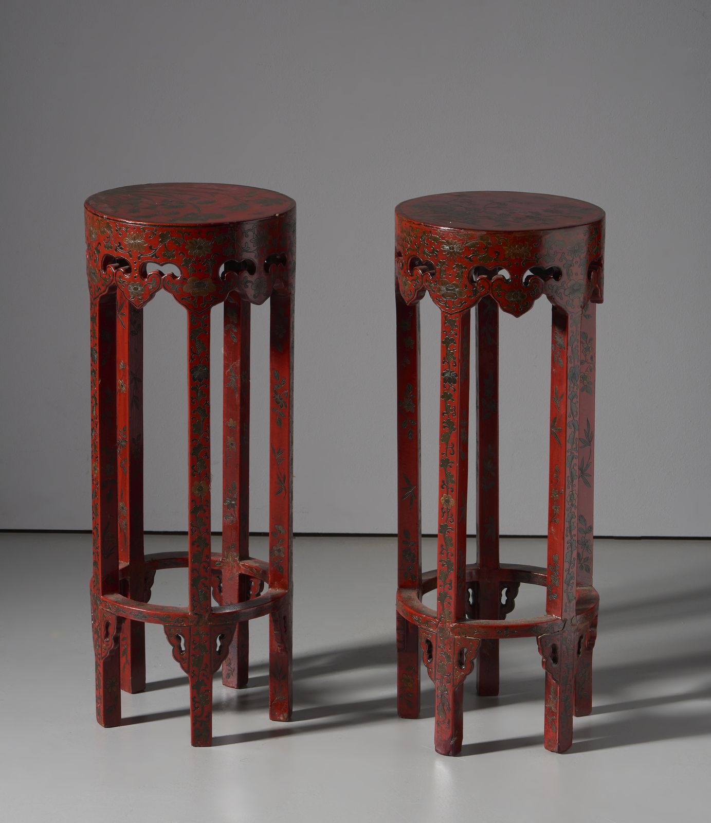 Dalla forma elegante ed armoniosa, sono decorati con uccelli ed aironi che volano tra rami fioriti su un luminoso sfondo in smalto blu. A corredo due belle basi in lacca rossa decorate a motivi floreali.