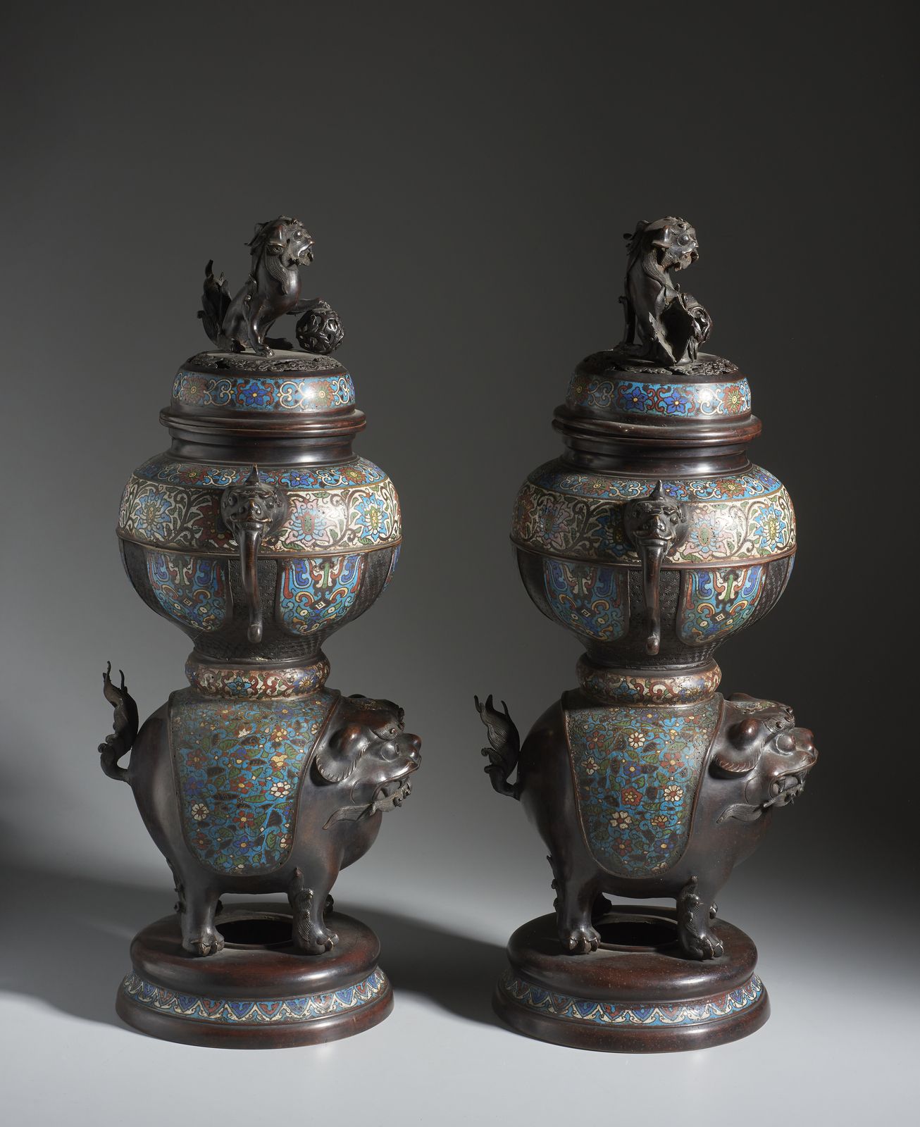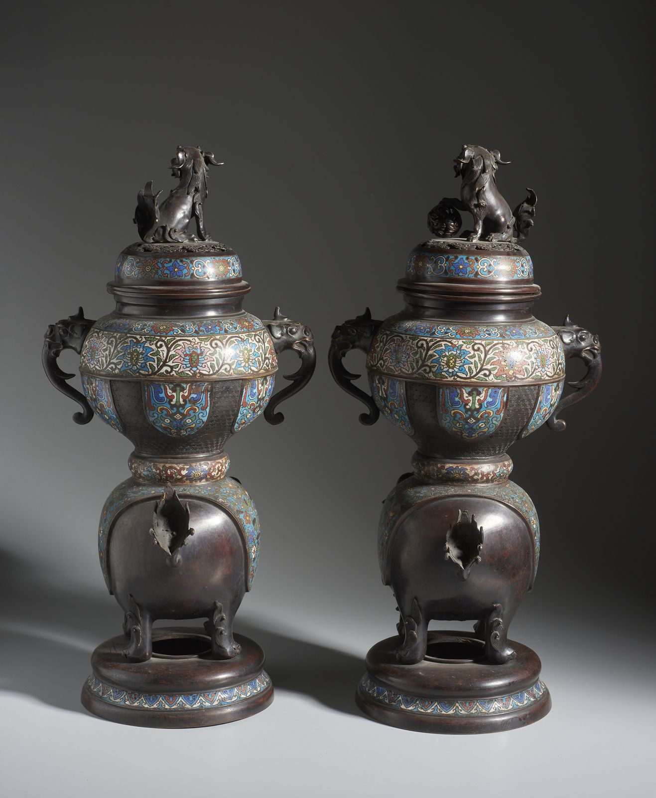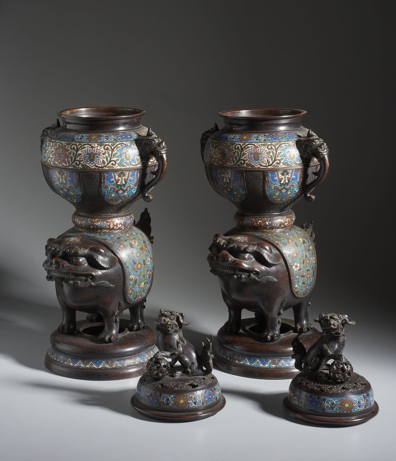 Dalla forma panciuta poggiano su imponenti basi raffiguranti leoni buddhisti. tutta la decorazione è realizzata in smalto cloisonné con fiori di loto e fogliame si fondo turchese. Coronati da grandi coperchi con prese a forma di cane di Pho.
