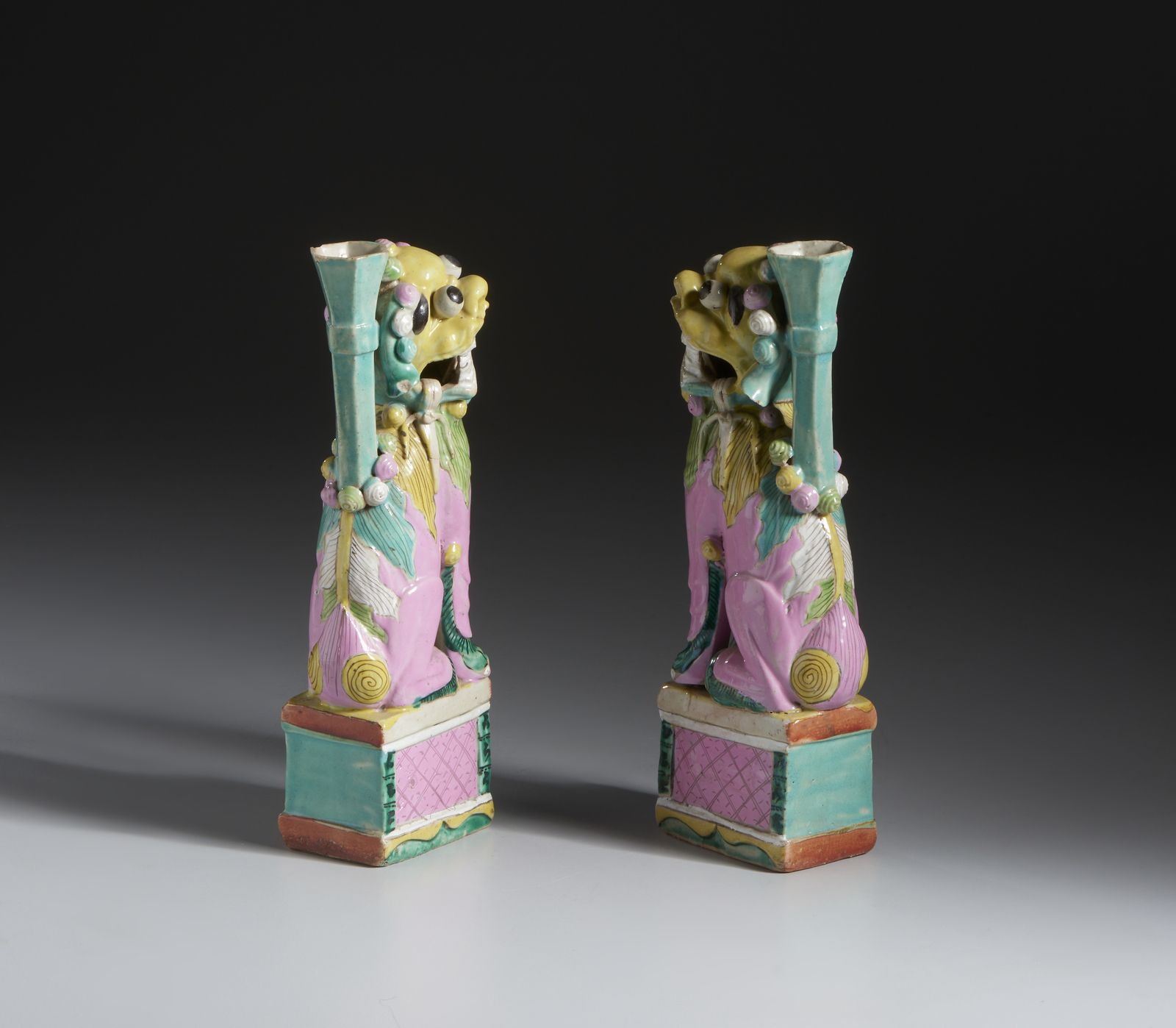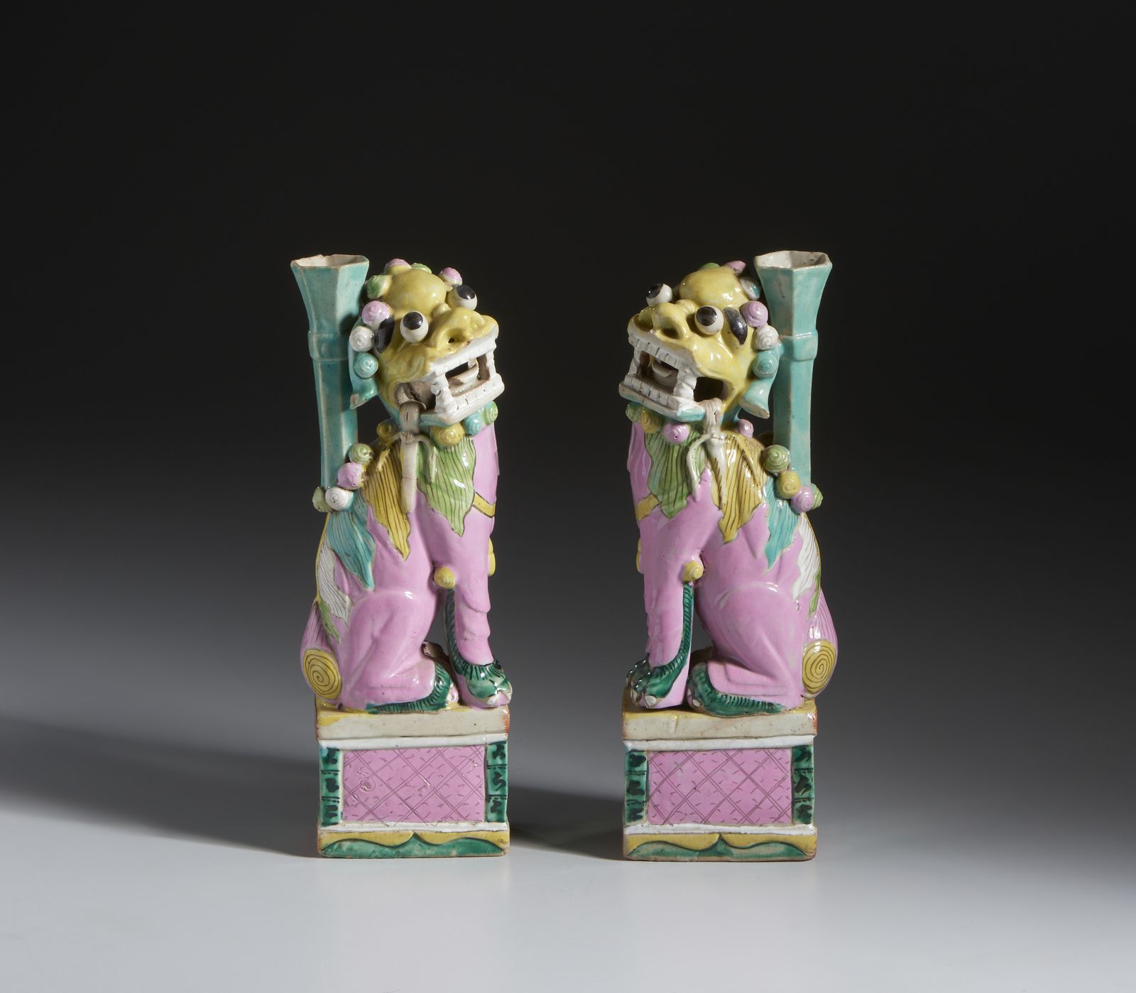 I due leoni poggiano su una base rettangolare e sono raffigurati accovacciati sulle zampe posteriori reggendo sulla schiena due cannule leggermente svasate atte a contenere i bastoncini dell'incenso. Sono ricoperti da smalti vivaci tra cui predomina il colore rosa. fine del periodo Qianlong (1736-1795).