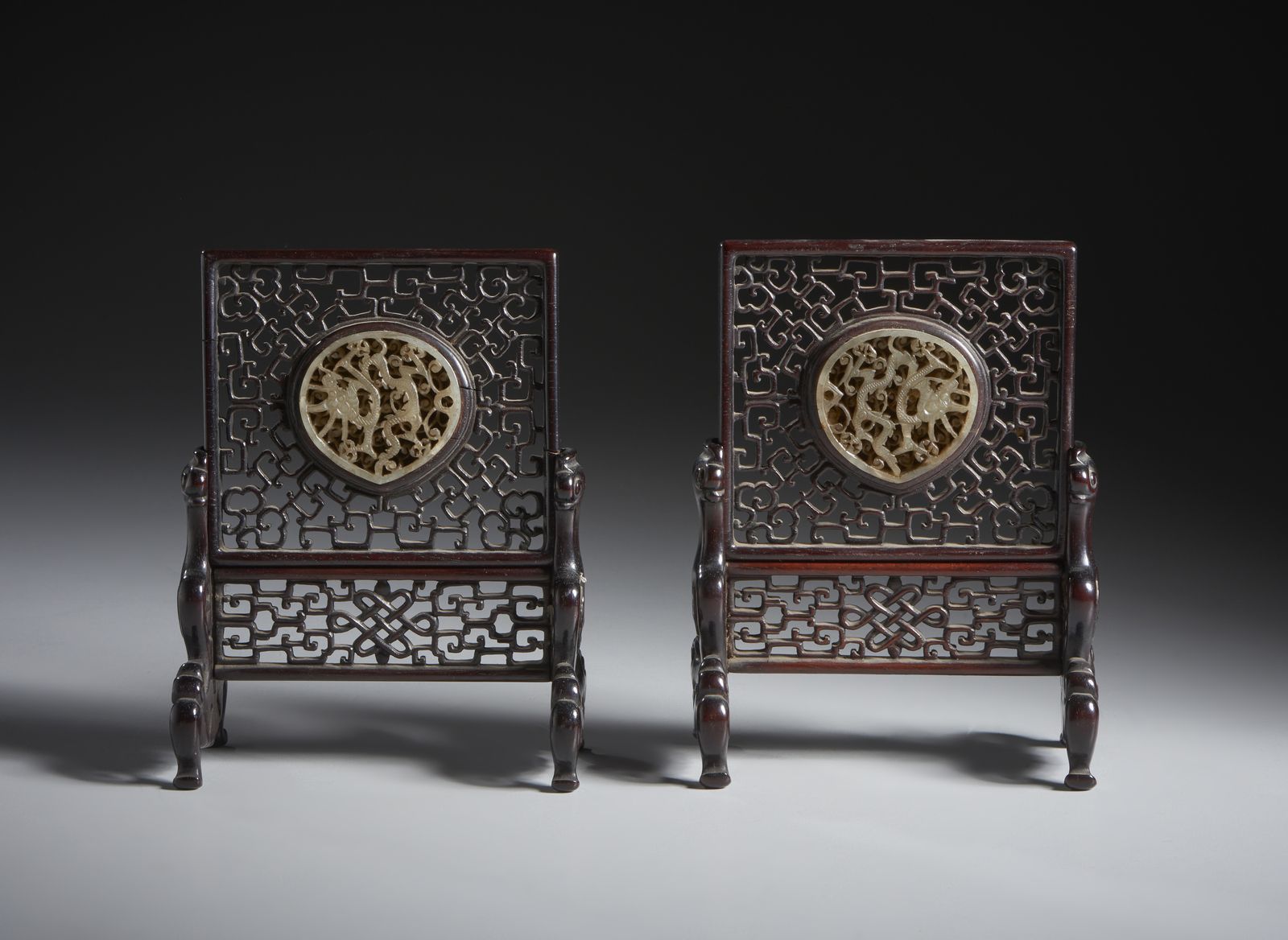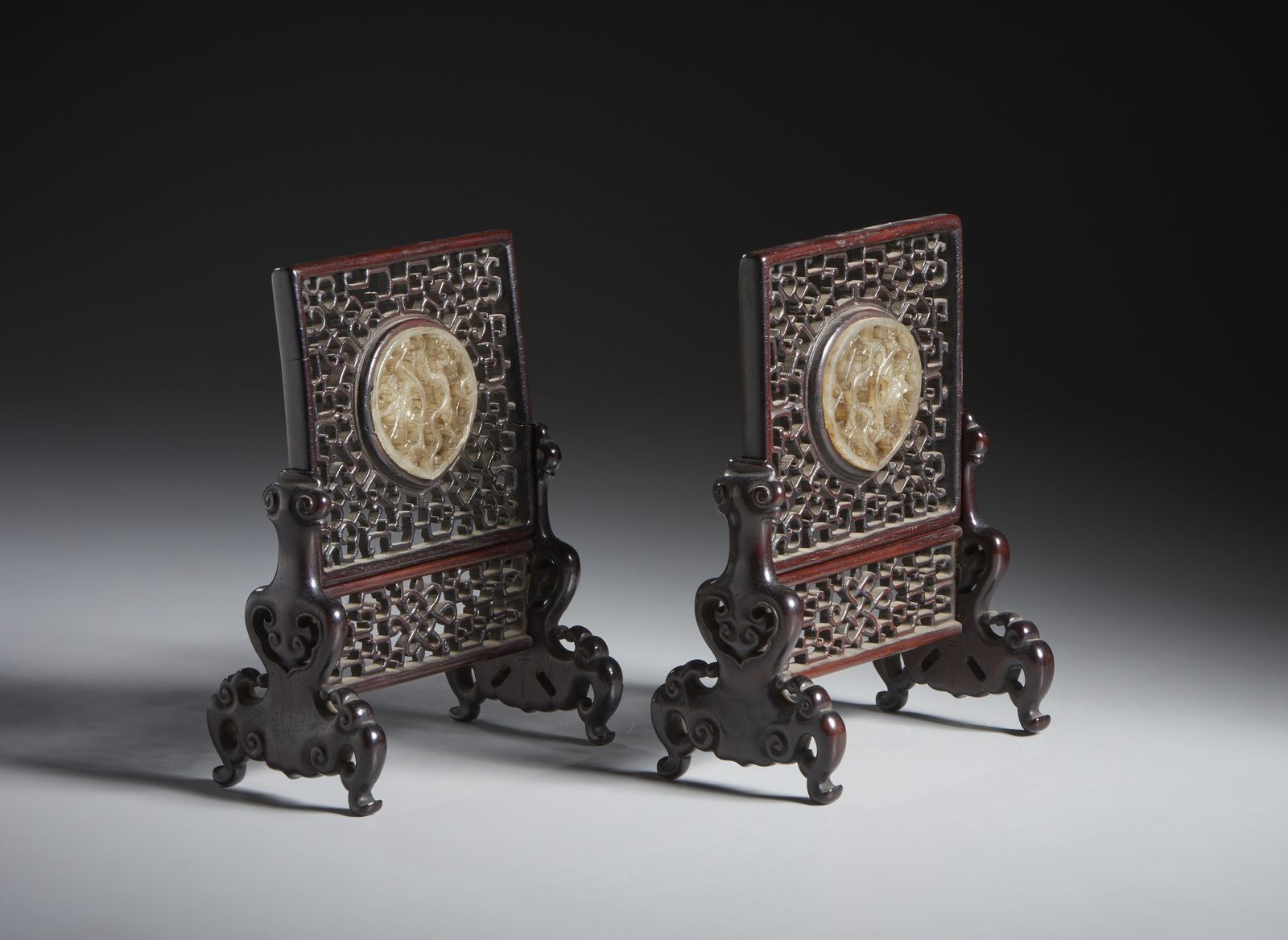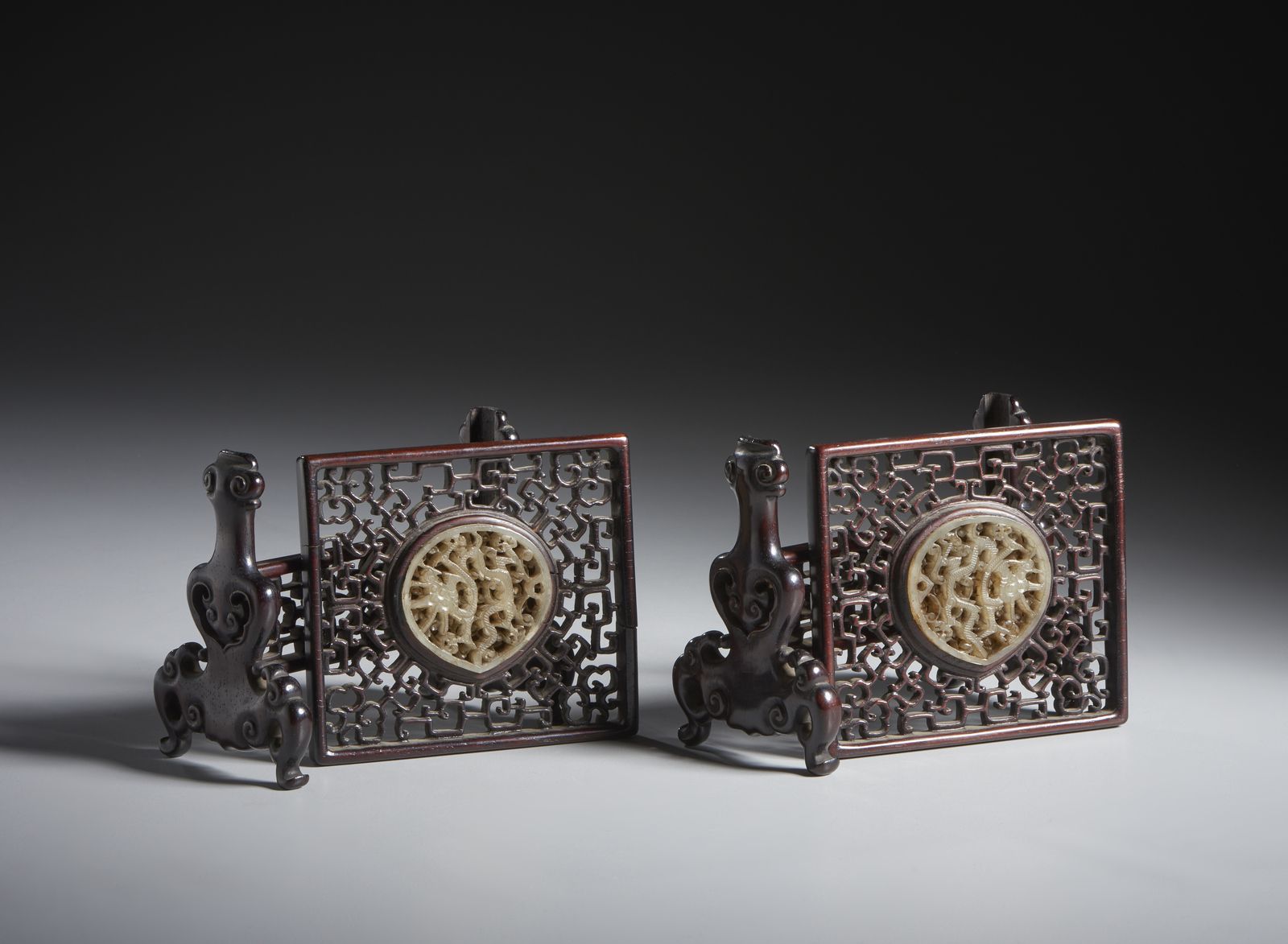 in legno di rosa finemente lavorato, ciascuno arricchito da una placca in giada verde chiaro incastonata al centro. Ogni placca dalla forma a goccia è scolpita con un raffinato traforo su cui a rilievo emerge la figura di un drago in stile arcaico.