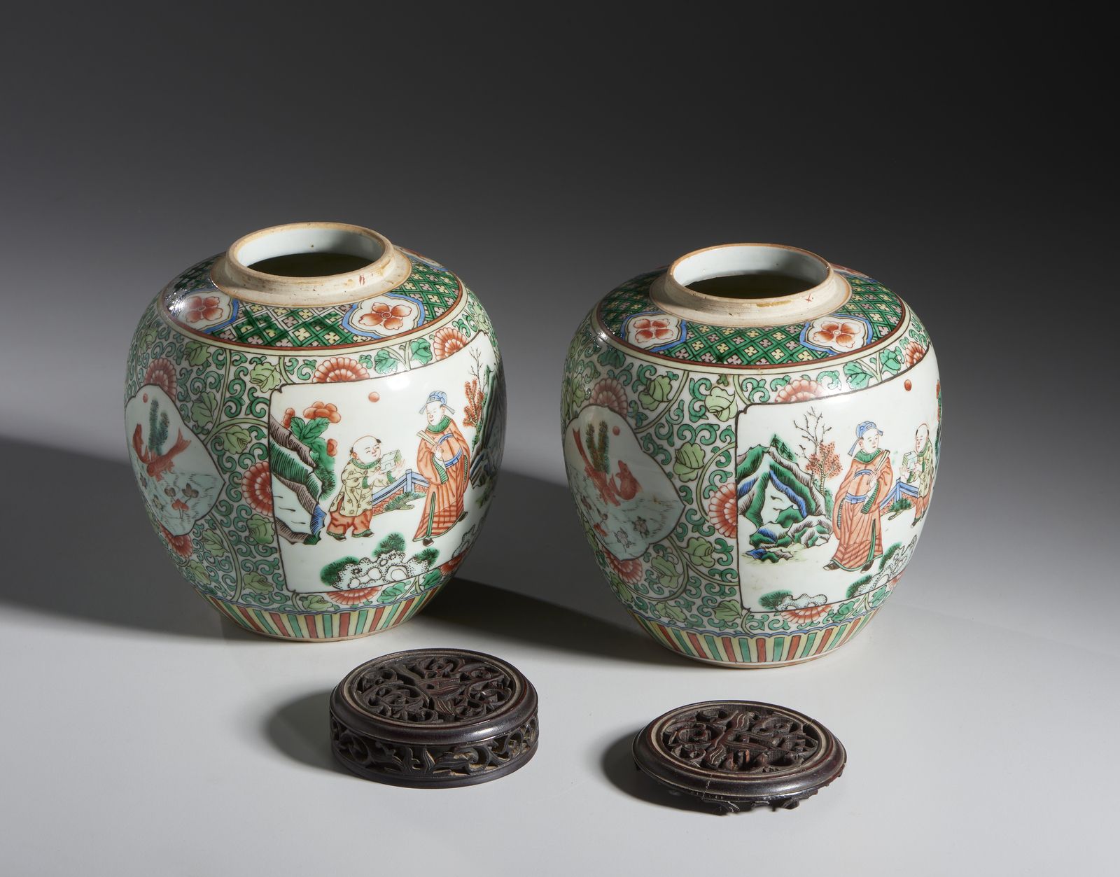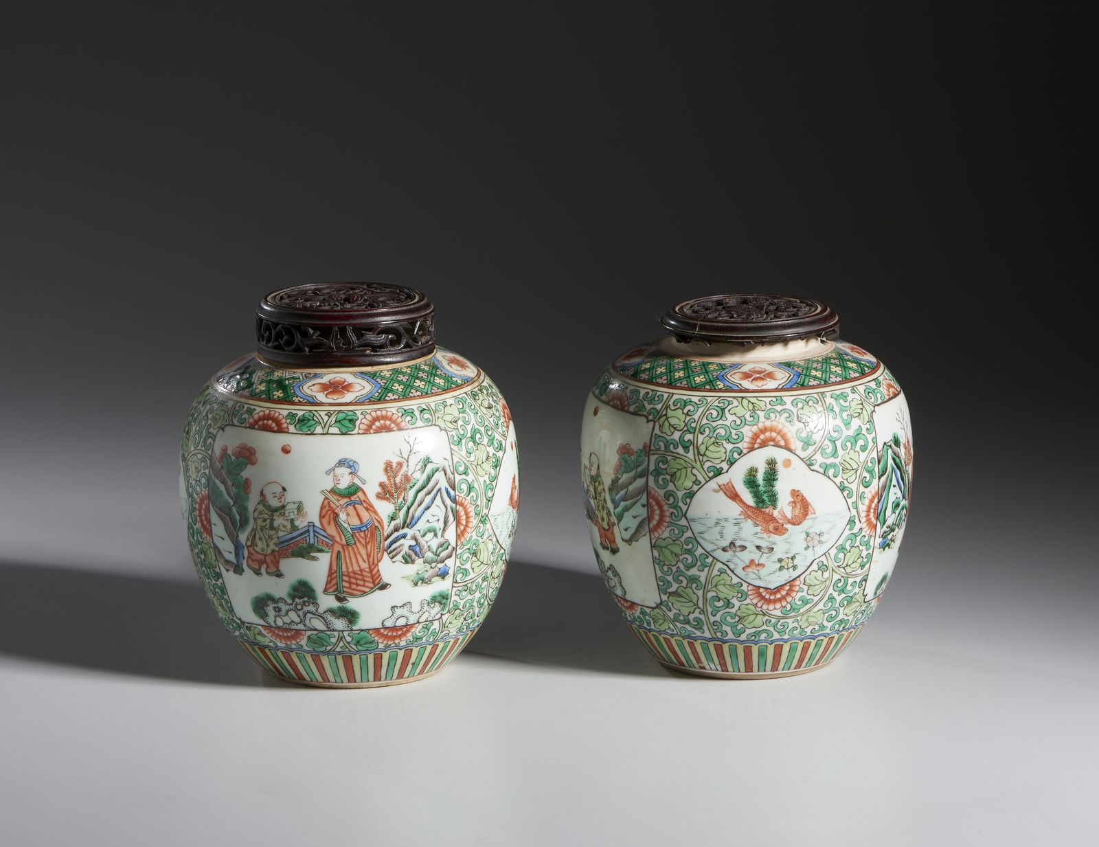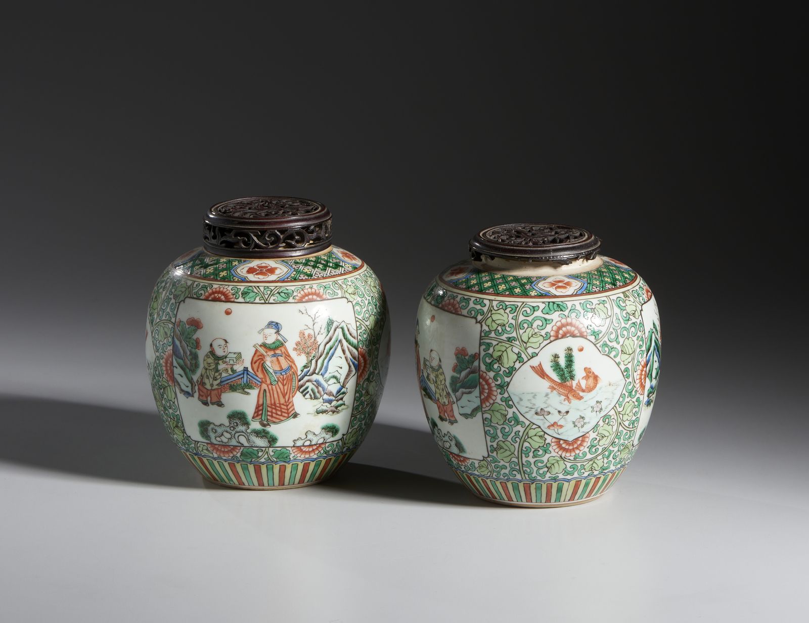Coppia di potiche in porcellana dipinta nei toni della famiglia verde. Cina, Dinastia [..]