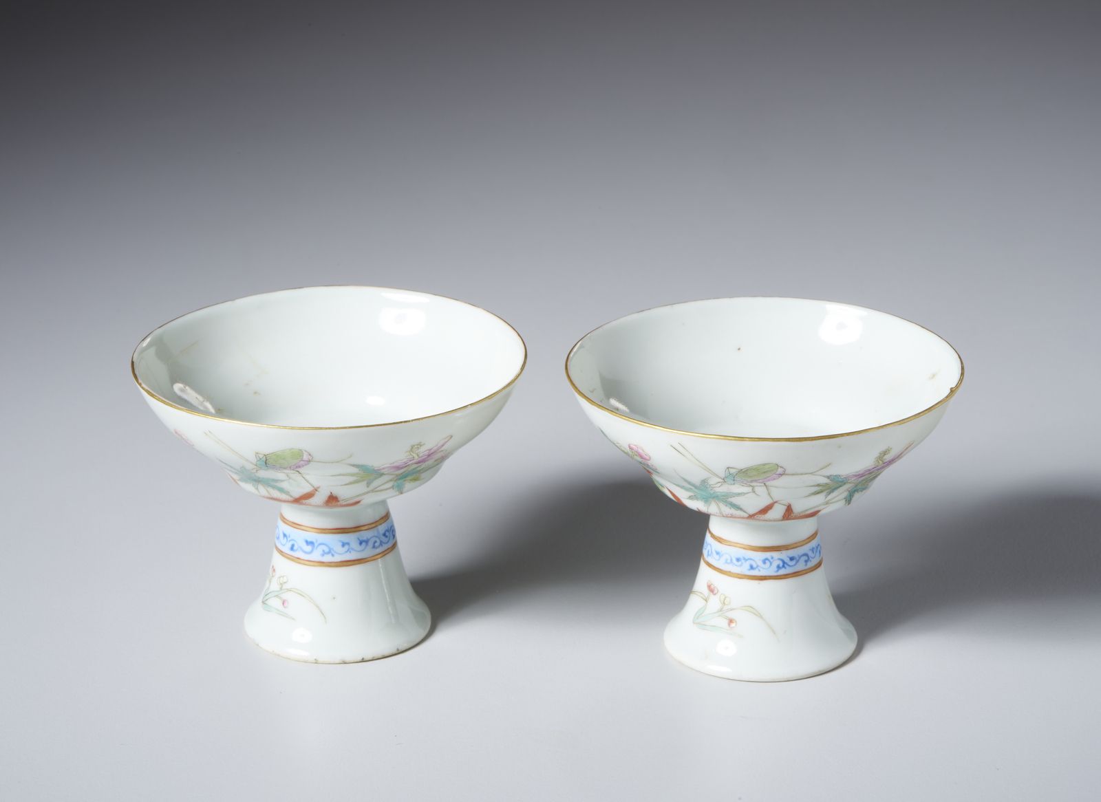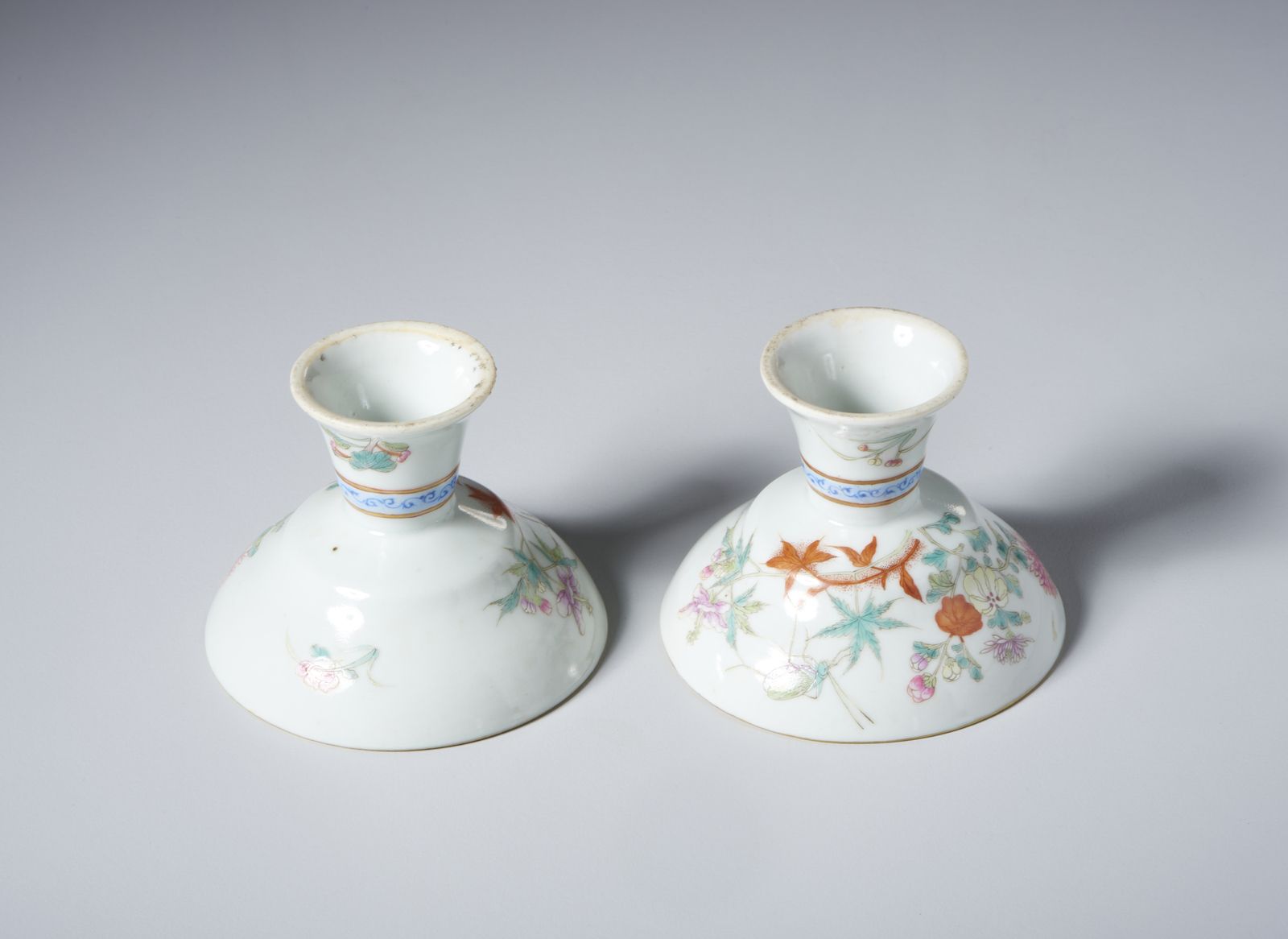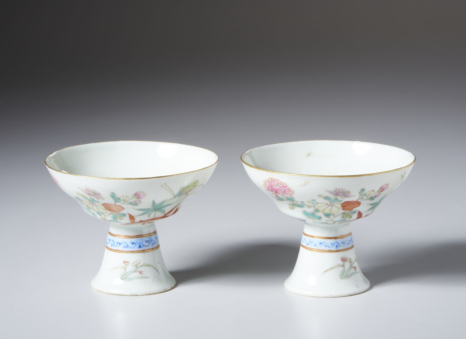 in porcellana bianca vivacemente decorate nella paletta fencai con motivo di fiori multicolori.