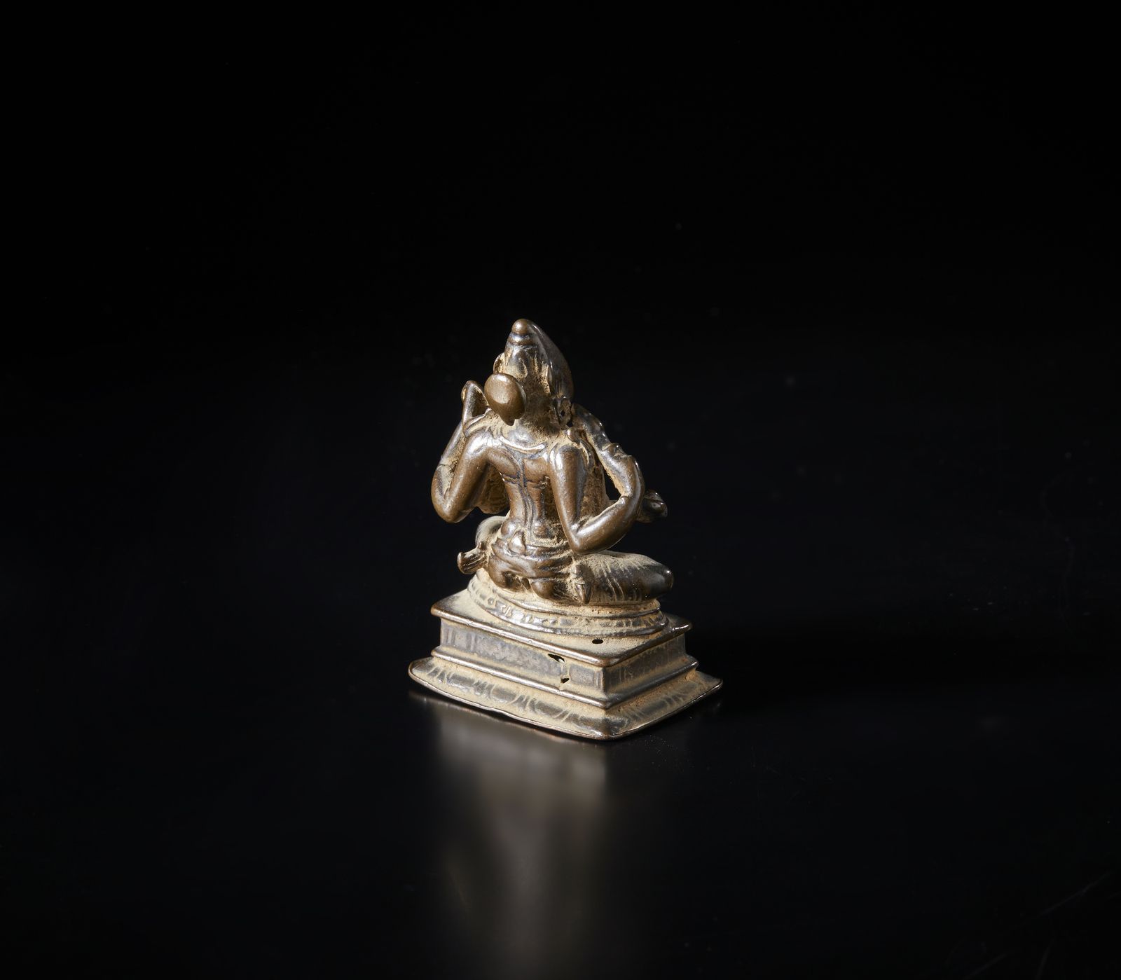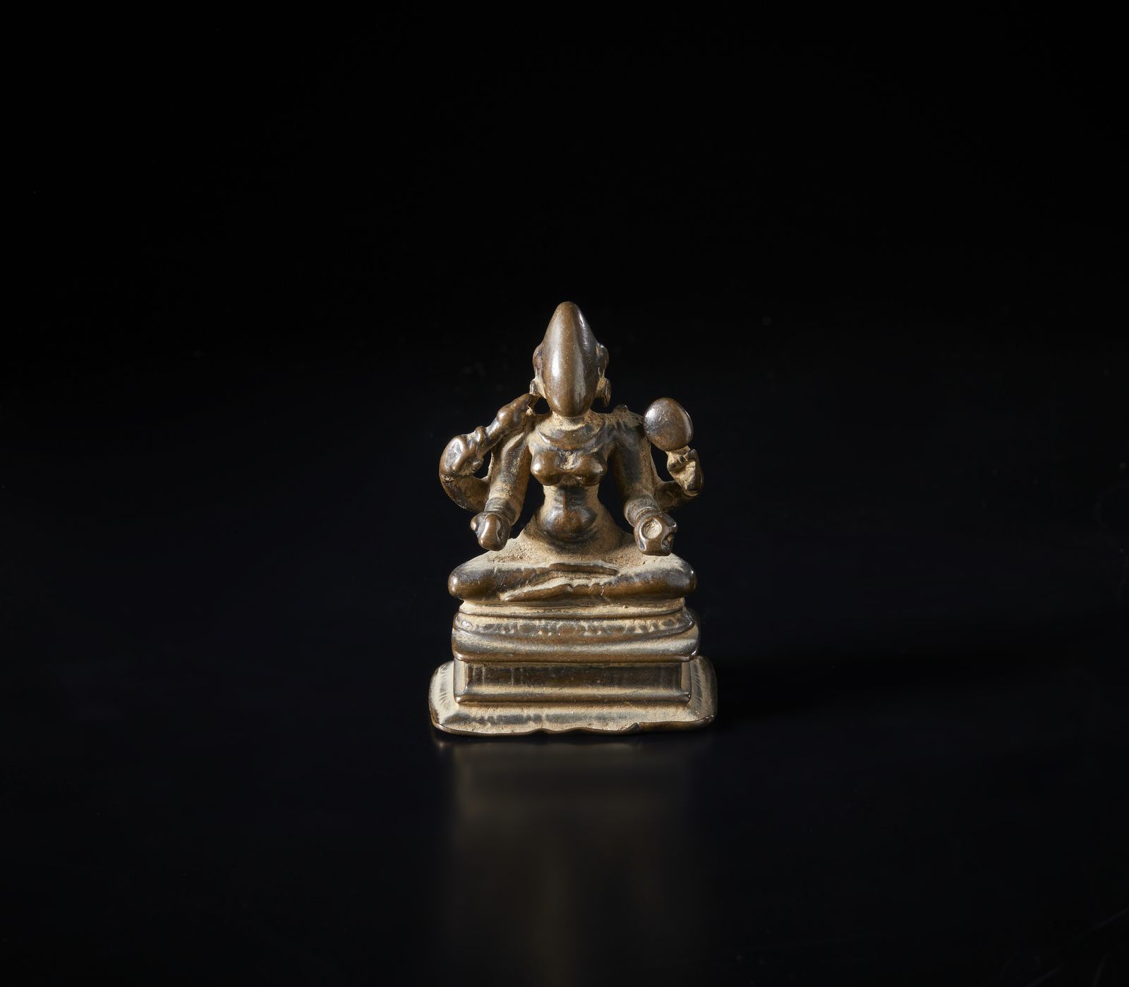 Raffigurante divinità a quattro braccia seduta su un piedistallo a fiore di loto sostenuta da un piedistallo rettangolare.Provenienza: Collezione Berger.