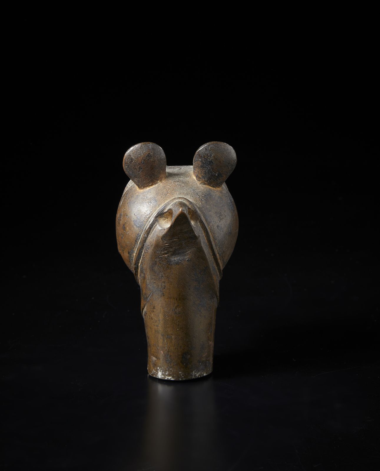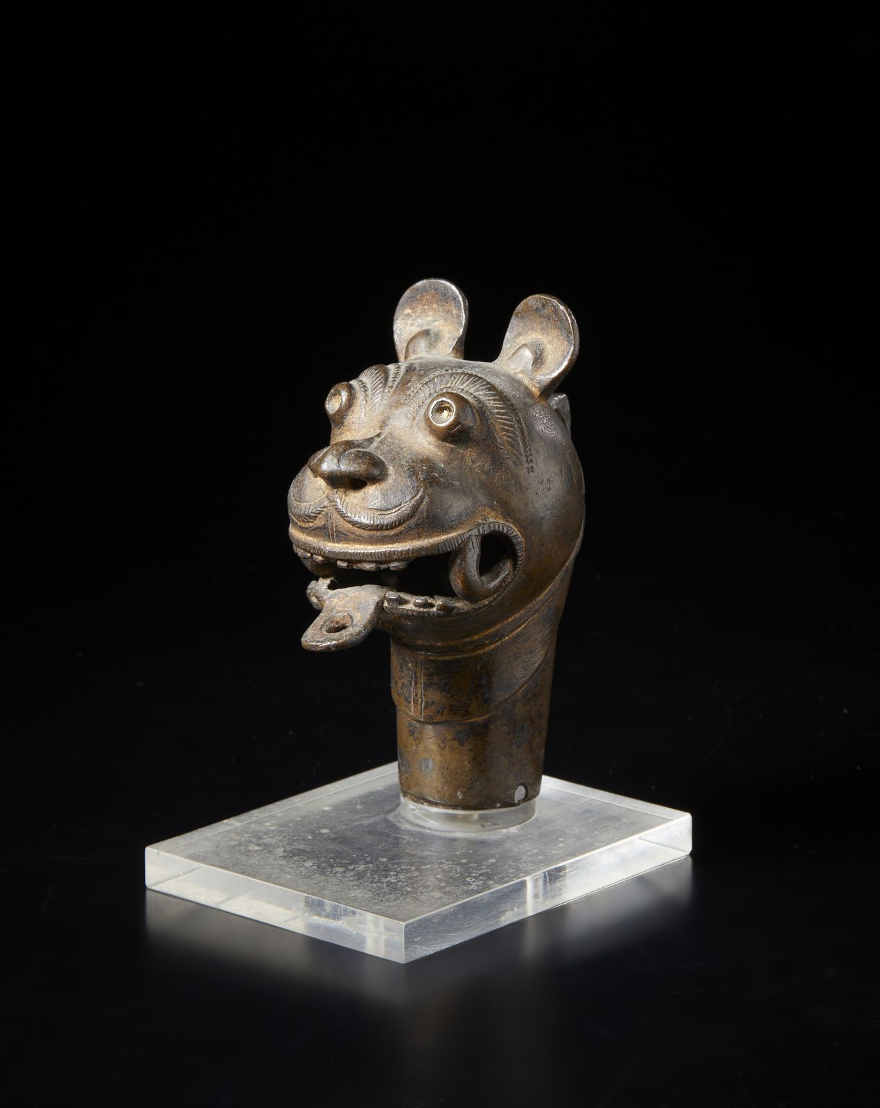 Fusione in bronzo a patina scura raffigurante una testa di leone con interno cavo. Articoli simili vengono spesso descritti come ''finali di portantina'' quindi è possibile che questo oggetto rientri in questa categoria, seppur di dimensioni più piccole rispetto alla consuetudine.