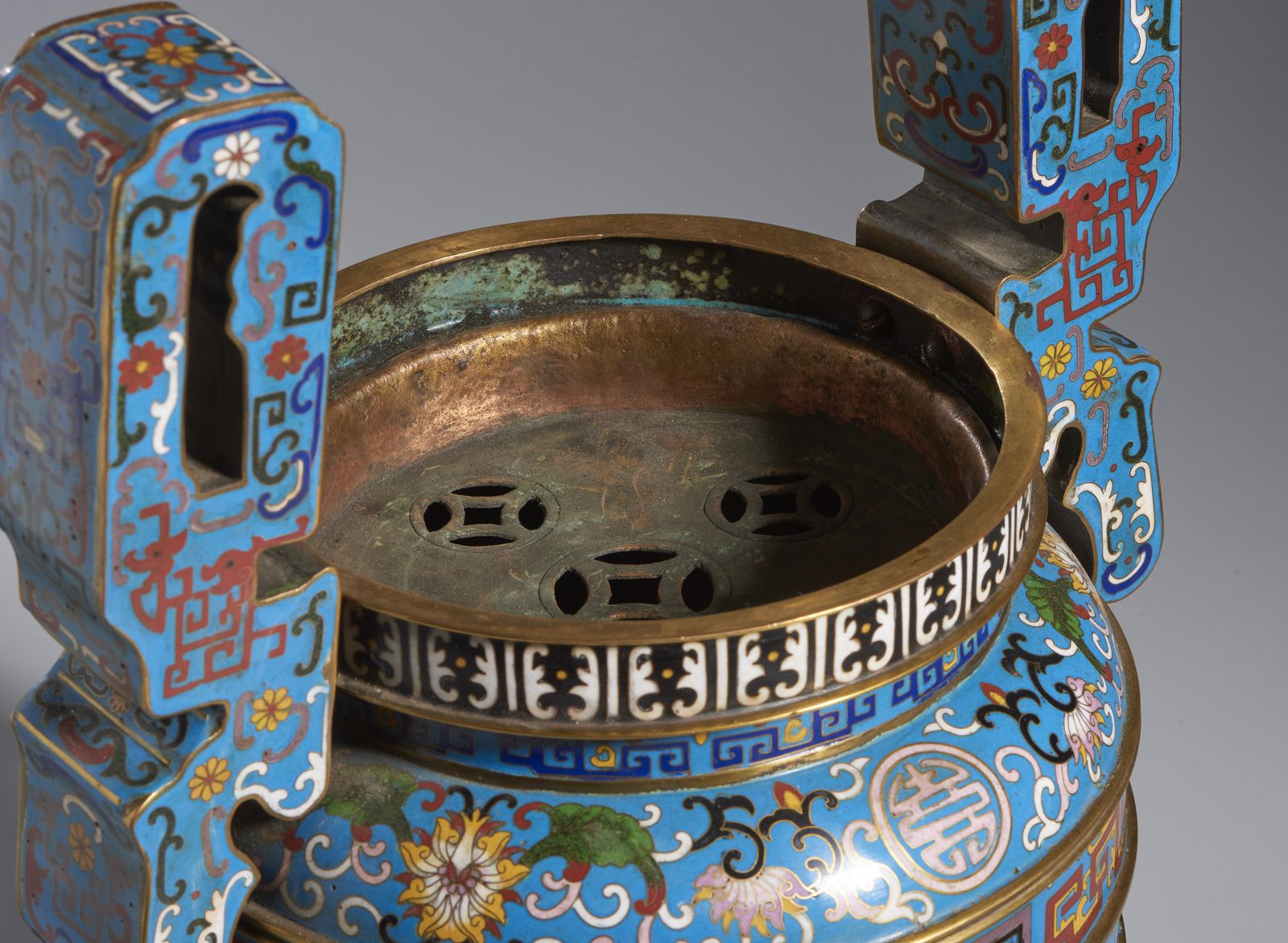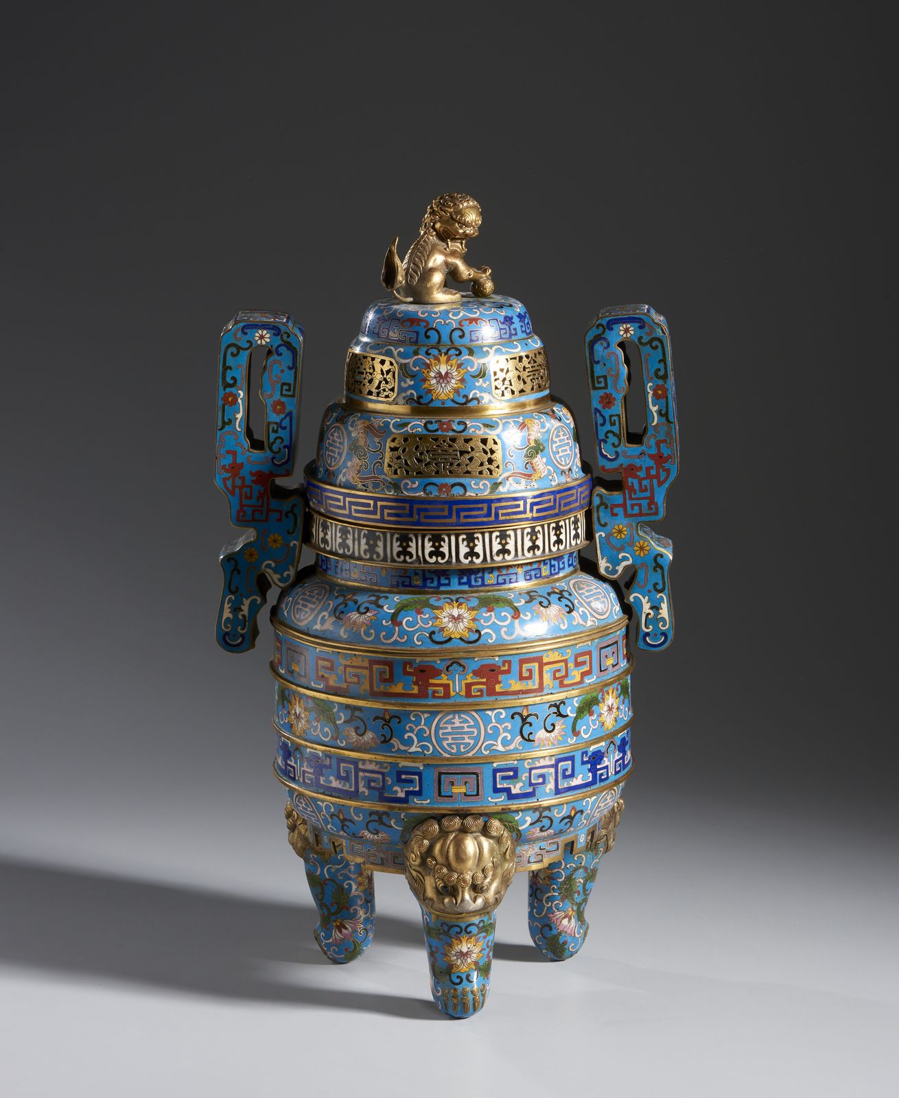 Grande corpo ovoidale si poggia su tre gambe che fuoriescono dalle fauci di tre teste leonine. Il corpo è completamente decorato con elaborati disegni distribuiti su fasce orizzontali, anche i monumentali manici sono interamente ricoperti di smalti che compongono disegni arcaicizzanti su fondo azzurro. Il coperchio, che culmina con una presa dalle fattezze di un leone buddista, presenta riserve in bronzo dorato rettangolari traforate a motivi di pipistrelli e simboli di buon auspicio.