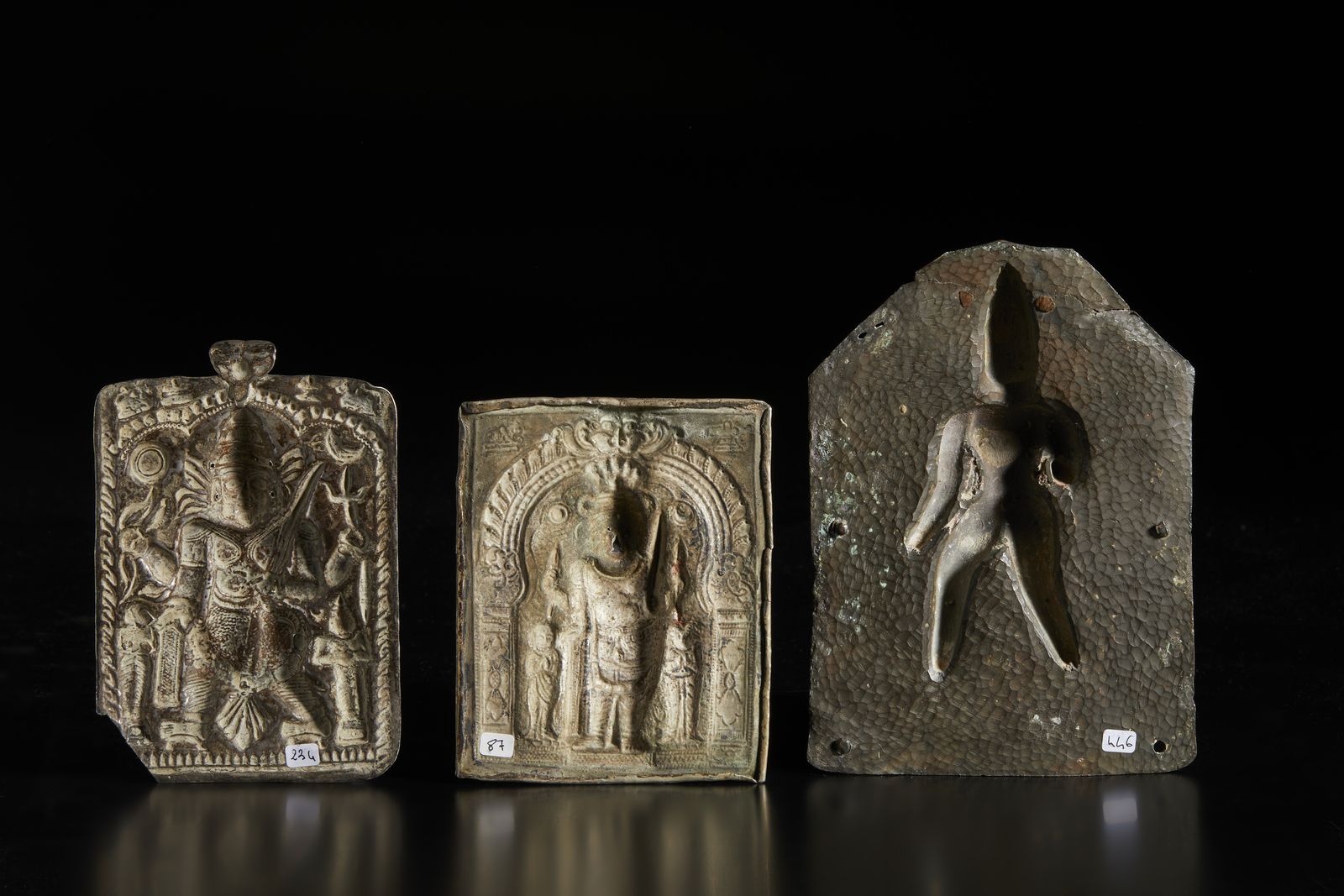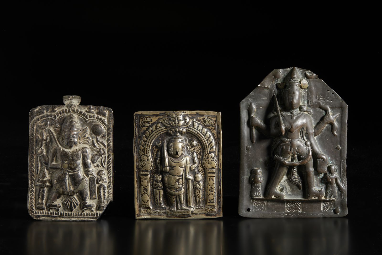 Include: una placca tribale. una in fusione raffigurante Shiva in armi scevro da ulteriori decorazioni ed una in argento sbalzato con torana elaborata.14,5x11,5 cm16,5x11 cm Provenienza: Collezione Berger.