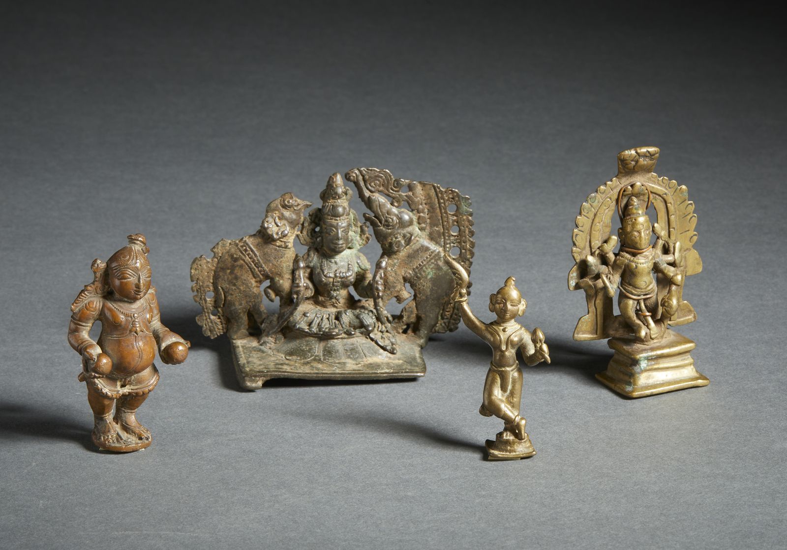 Include: Una Gajalakshmi proveniente probabilmente dalla regione del Kerala. una Durga Maharashtra in fusione d'ottone. un Balakrishna stante con due palle di burro ed una raffigurazione di Radha stante con un bocciolo di fiore di loto nella sia mano sinistra. Altre misure:8,5 x 5 cm7 x 4 cm6,5 x 4 cmProvenienza: Collezione Berger.