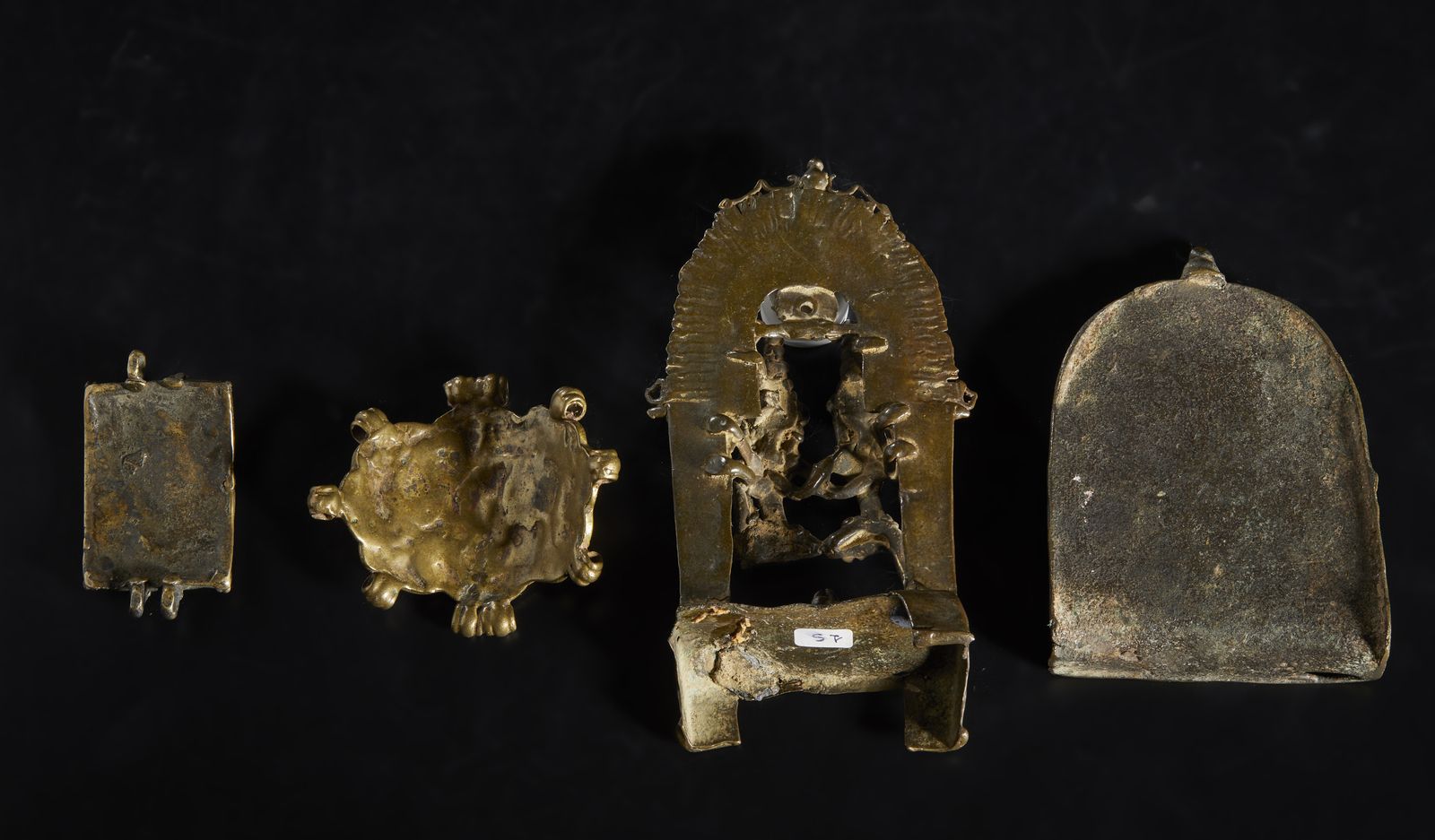 Include: Due altari devozionali in fusione di lega di rame raffiguranti Shiva, Parvati e figli e due ornamenti da braccio decorati con figure in rilievo. La misura indicata si riferisce all'oggetto più grande, gli altri:12 x 8 cm6,5 x 7,5 cm3,8 x 6,7 cmProvenienza: Collezione Berger.