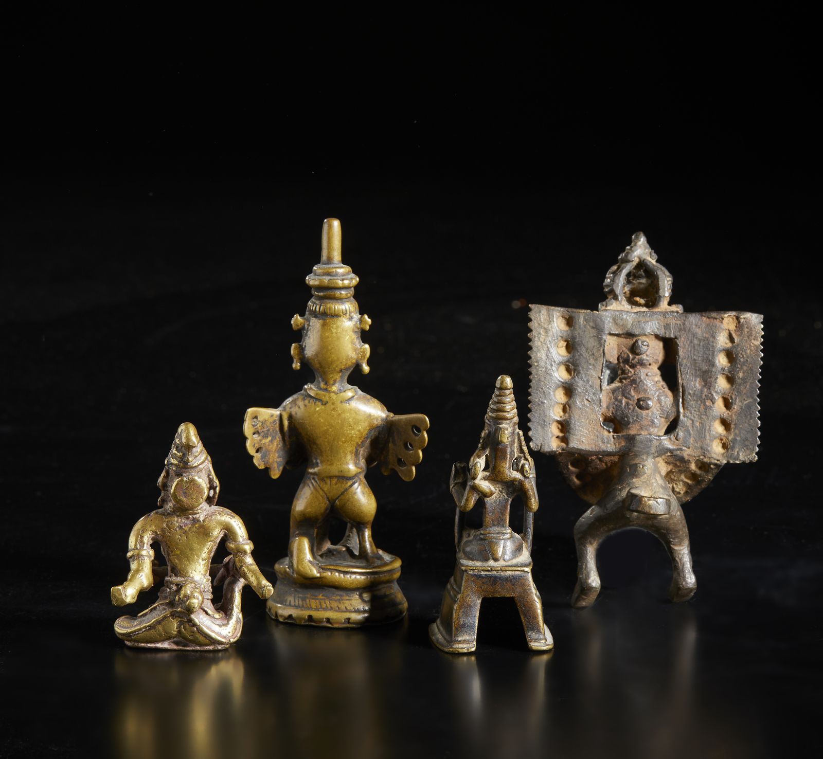Include: una raffigurazione di Garuda in genuflessione. una divinità popolare coronata stante e due sedute.La misura riportata fa riferimento all'oggetto più grande.Provenienza: Collezione Berger.