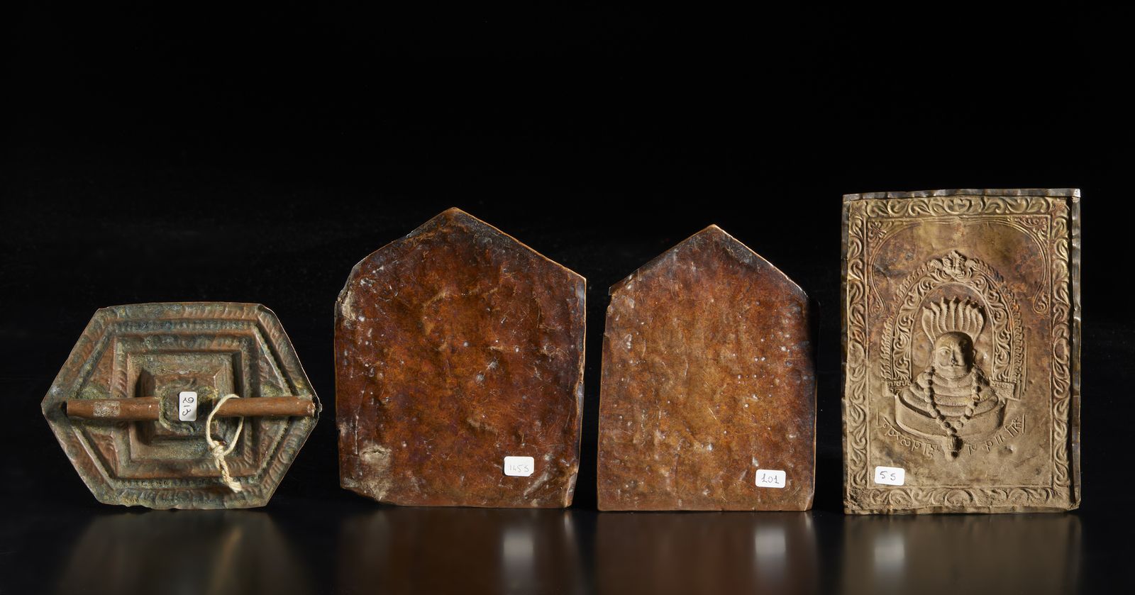 Include: una placca raffigurante Mukhalinga sormontato da serpenti naga e con iscrizione in devanagari. due placche tribali di cui una raffigurante Khandoba e Banai ed una placca con yoni (?). Le misure indicate si riferiscono al più grande.Altre misure: 13,50x11,50 cm14x12 cm 13x10 cm Provenienza: Collezione Berger.