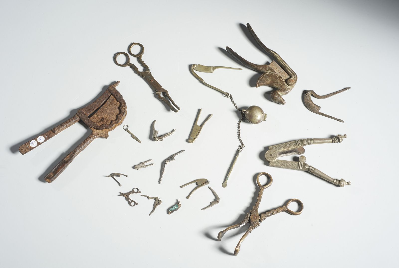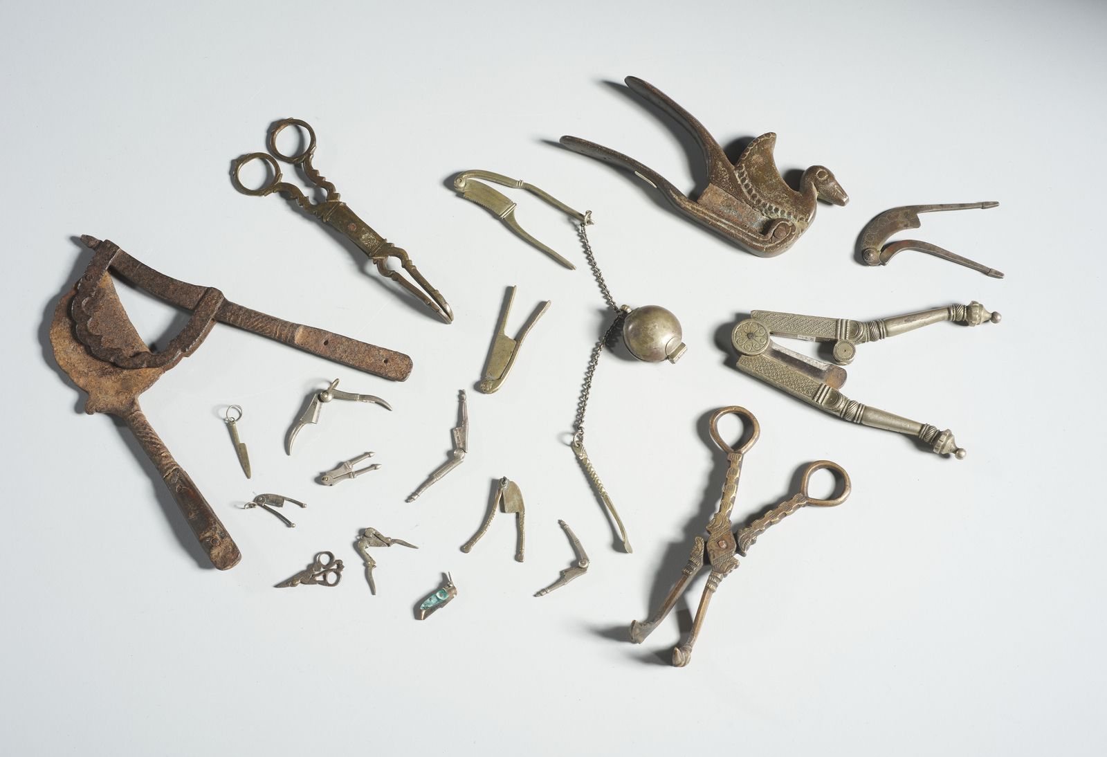 Gruppo di sedici forbici da betel di diverse dimensioni e due coltelli. Arte indiana, [..]