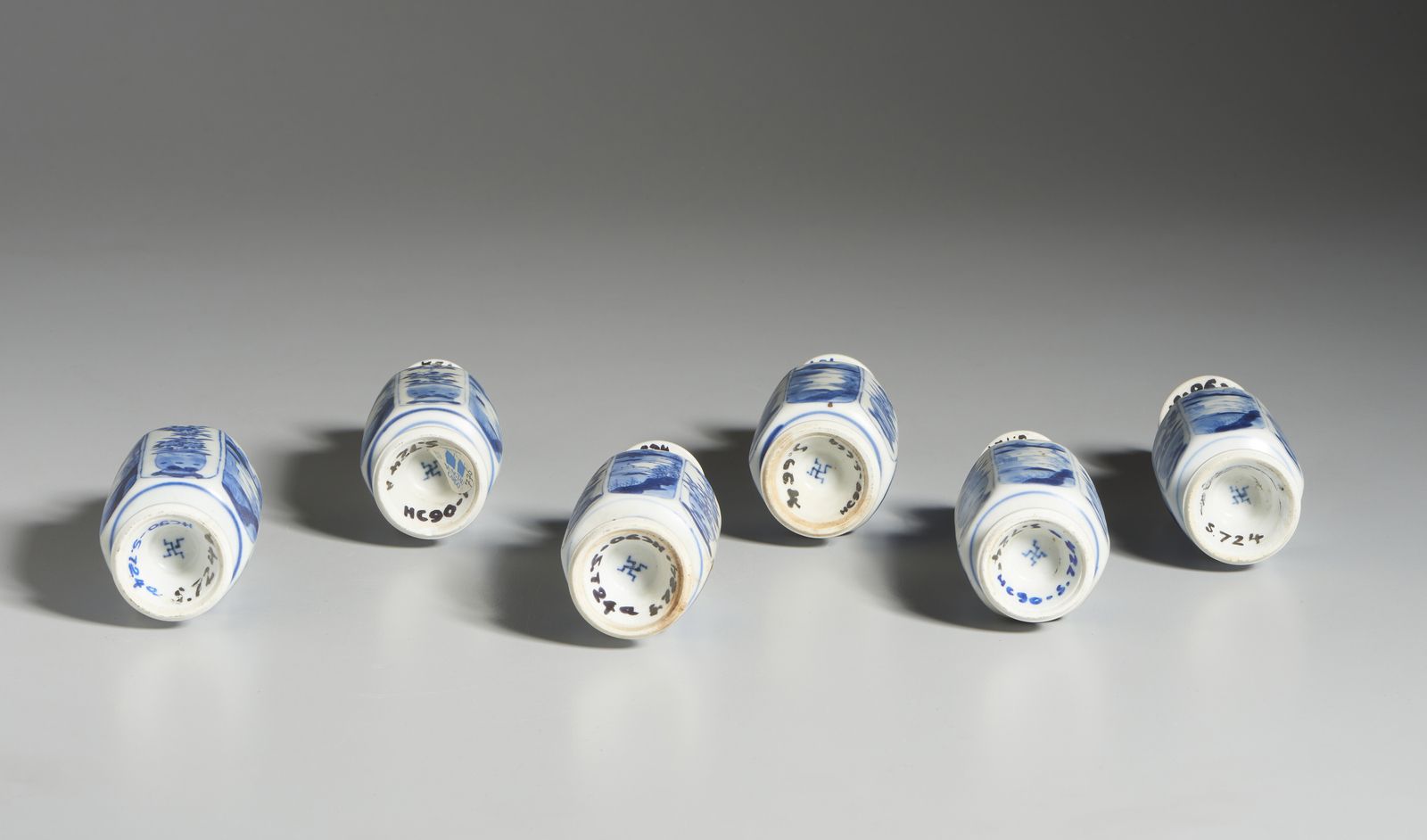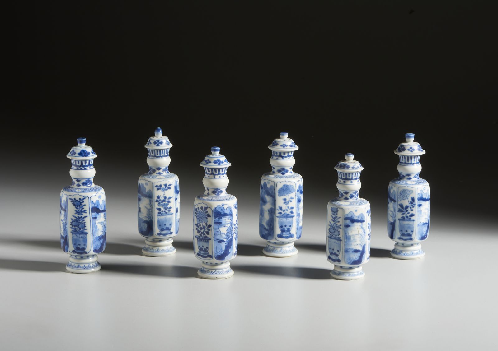 Gruppo di sei potiche a decoro bianco blu in porcellana. Cina, Dinastia Qing, Ka [..]