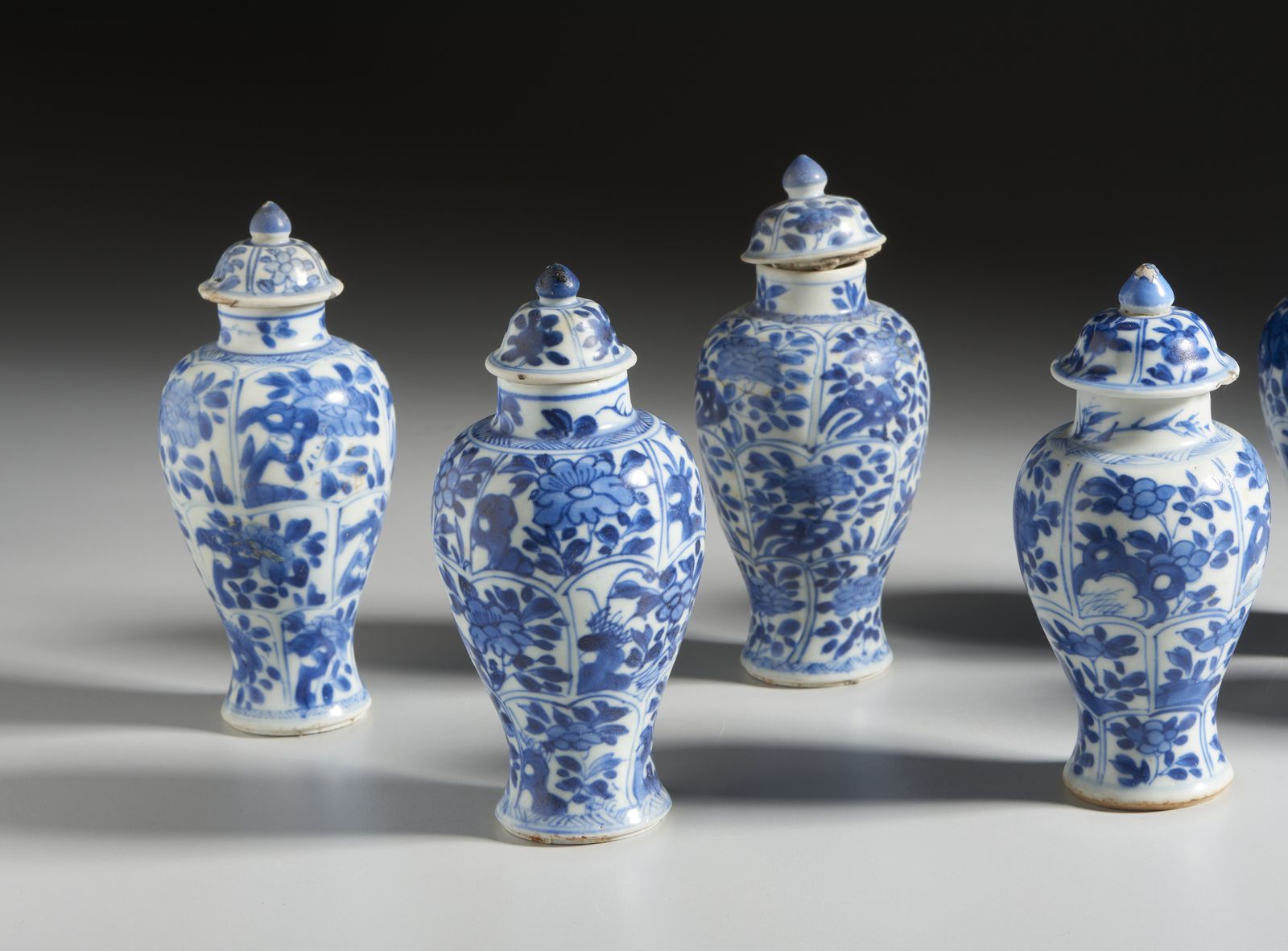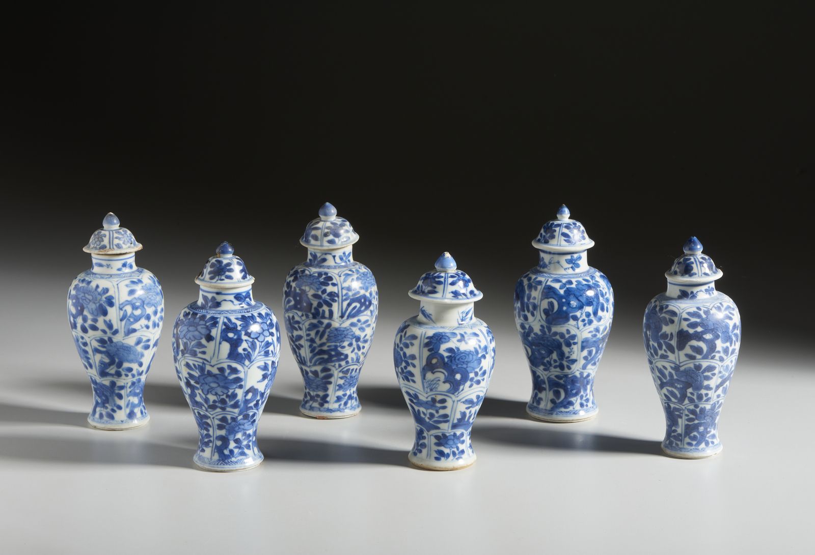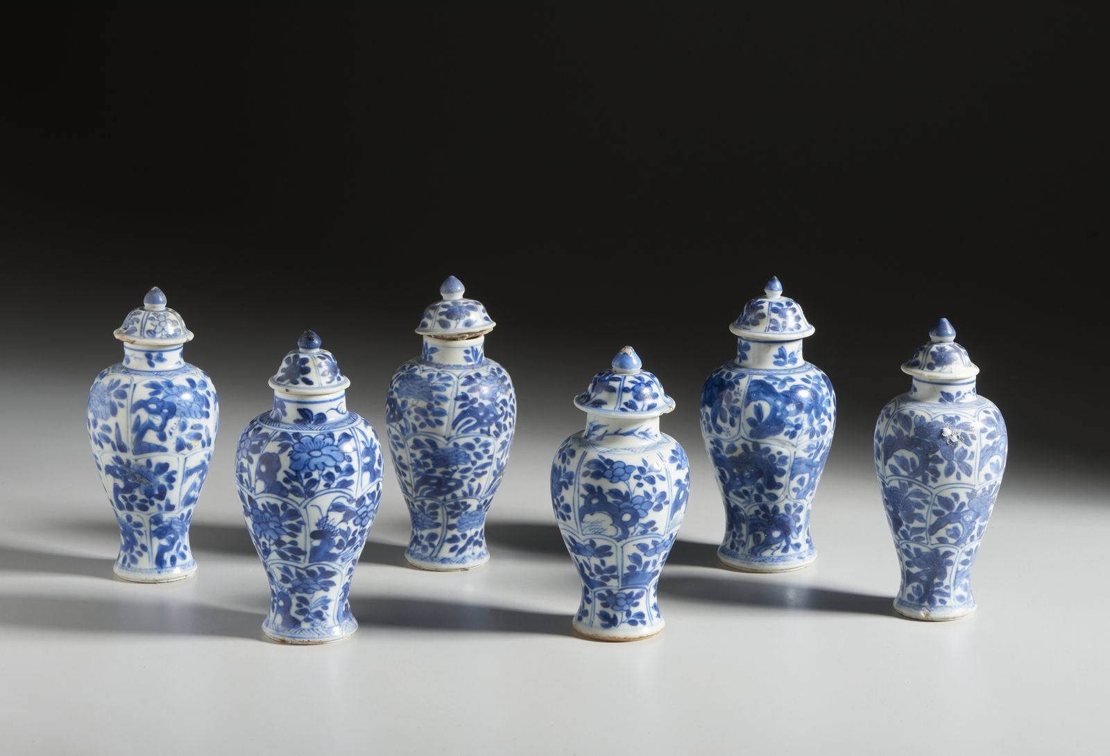 Gruppo di sei potiche in porcellana a decori bianco blu.Cina, Dinastia Qing, Kan [..]