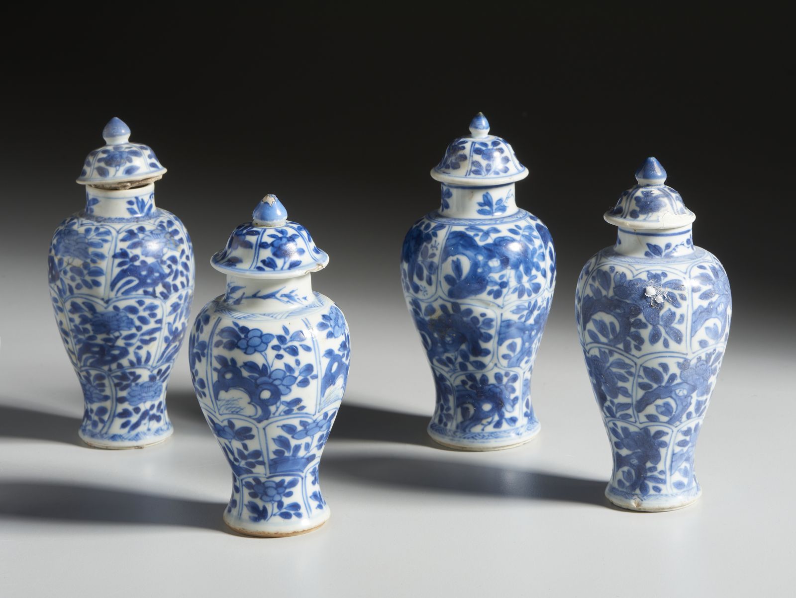 Decoro blu cobalto dalla forma slanciata a balaustro coronata da piccoli coperchi. Ogni vaso è dipinto con fiori stilizzati che avvolgono a spirale il corpo lobato. Provenienza: Vung Tau cargo, una nave in viaggio Dalla Cina a Batavia affondata nel 1690 circa.