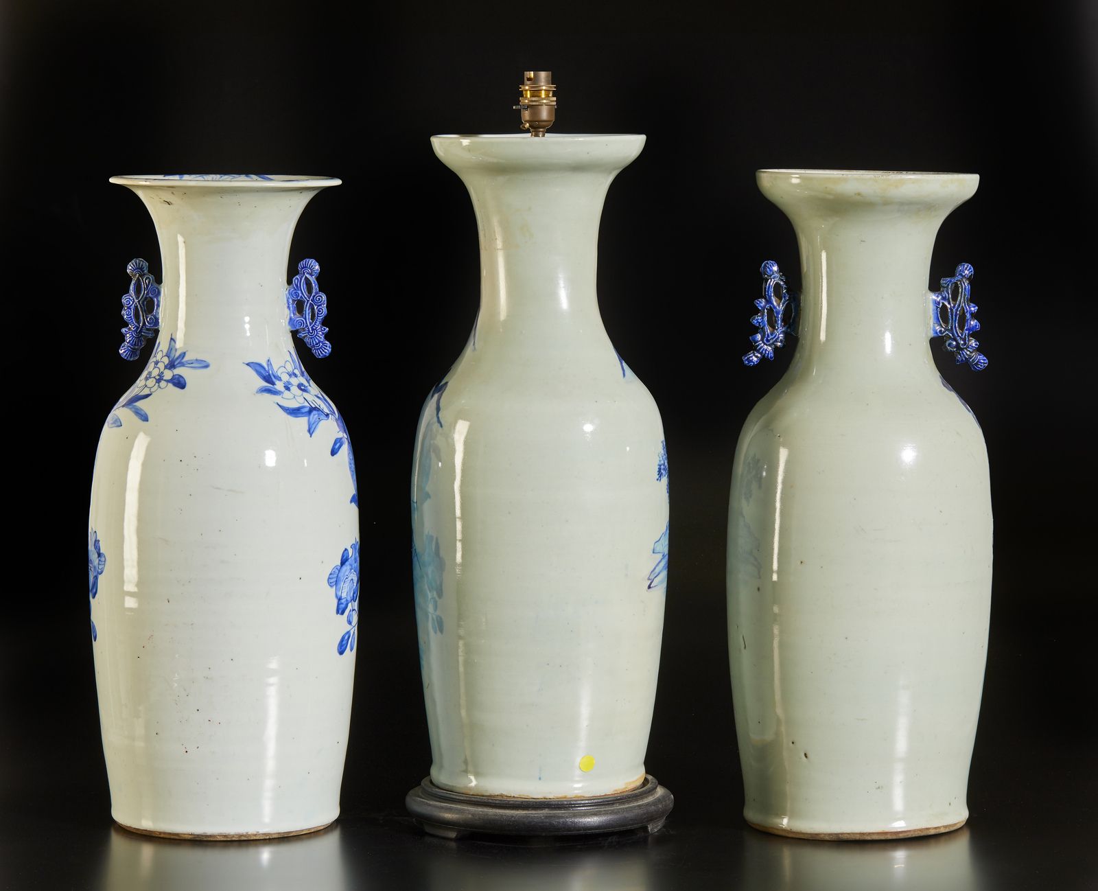 Lotto composto da tre vasi a balaustro dipinti in blu cobalto sottocoperta con paesaggio o con ideogrammi e simboli di buon auspicio.