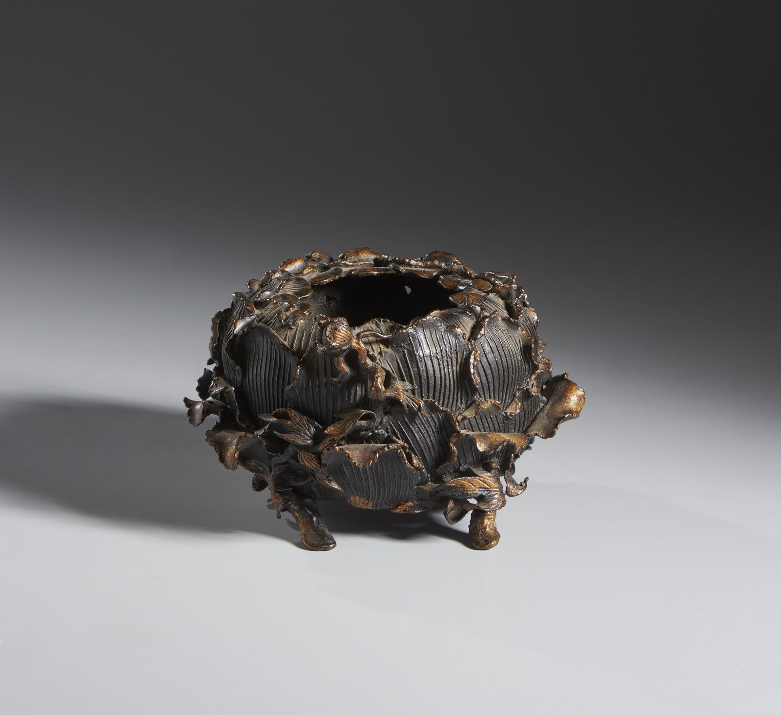 Tracce di dorature a forma di fiore di loto. I petali elegantemente modellati sono incisi aumentando il senso di movimento della corolla semischiusa.