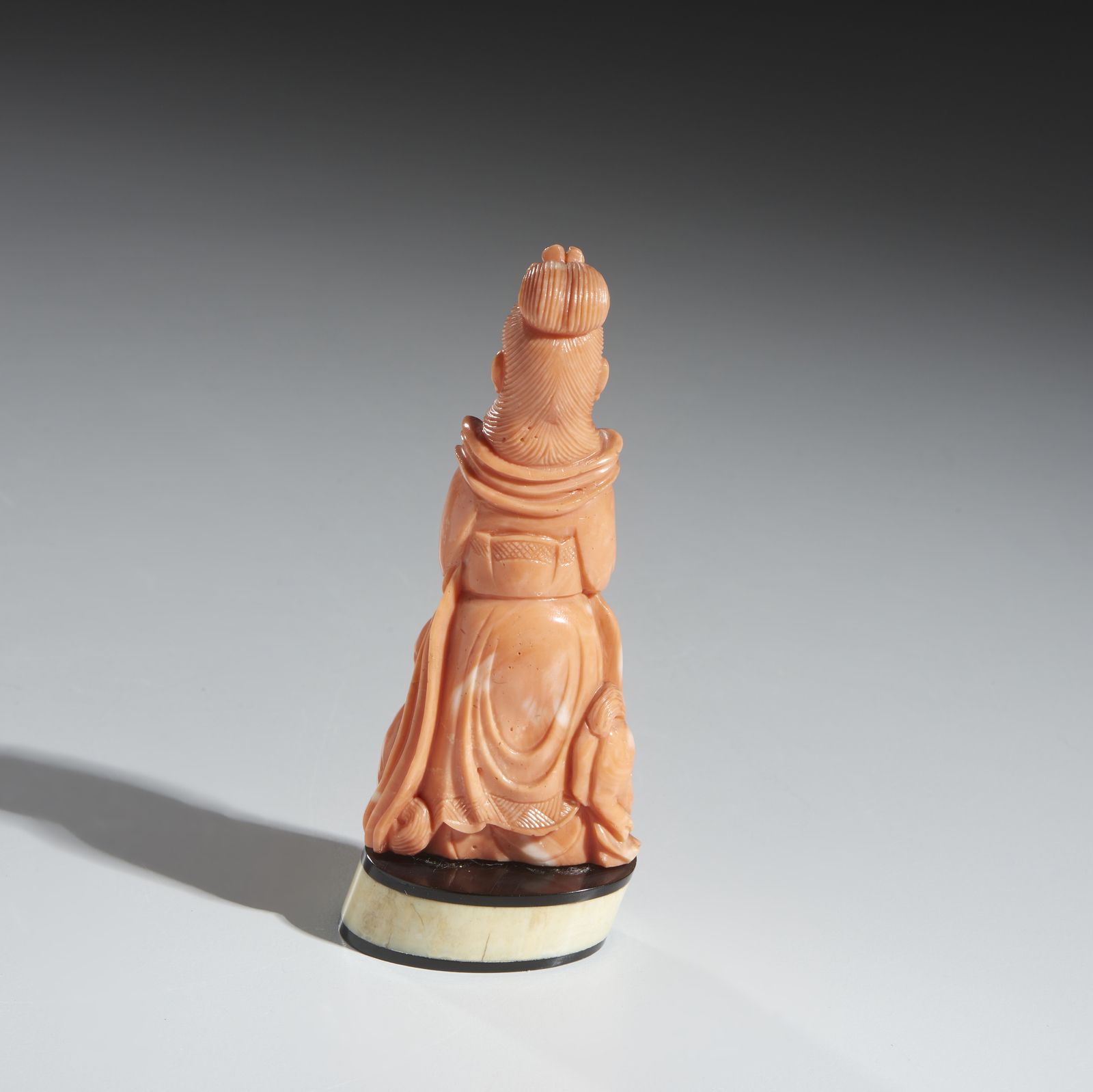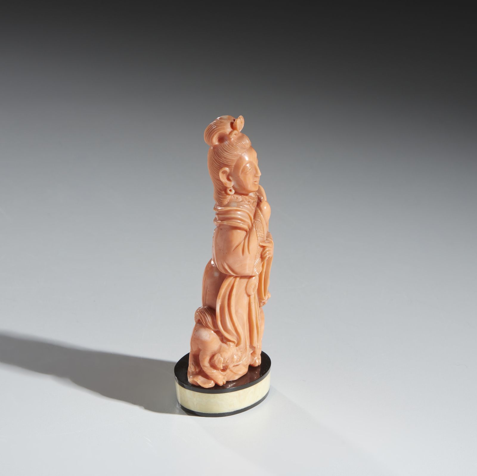 Intaglio in corallo raffigurante dama elegantemente vestita con due cagnolini ai [..]
