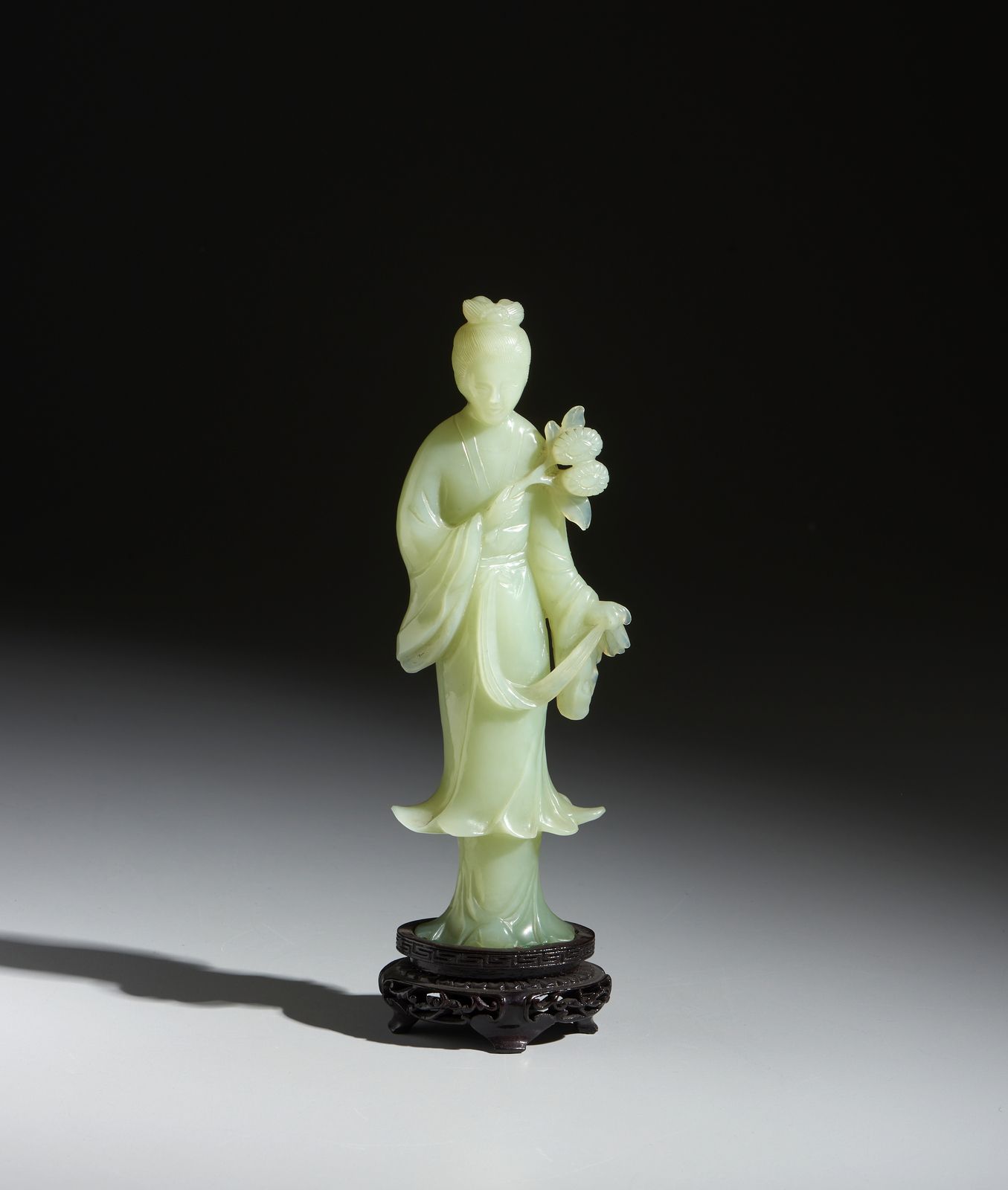 Intaglio in serpentino raffigurante dama elegantemente vestita con fiori.Cina, XX [..]