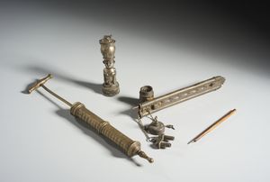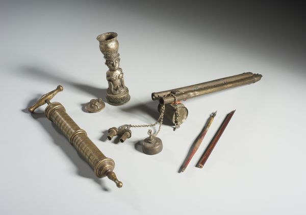 Lotto di tre oggetti: siringa holy festival, contenitore rituale e portapenne. India, [..]