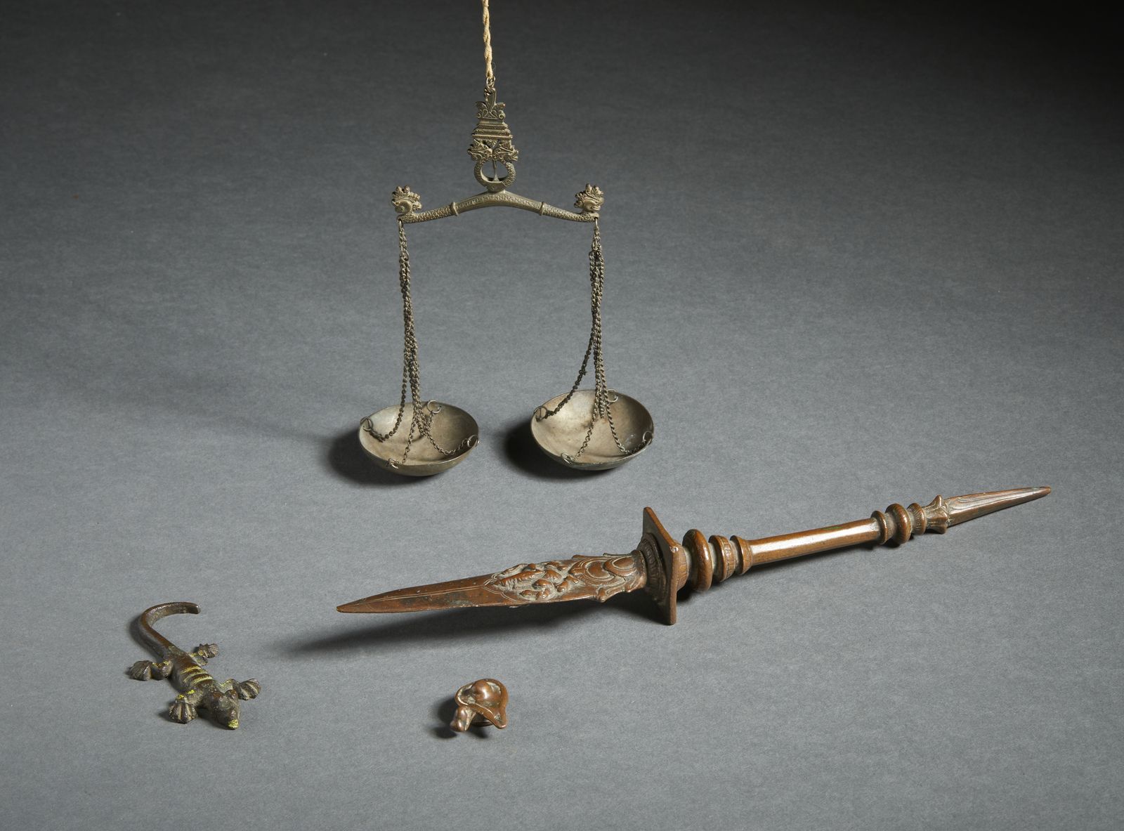 Include: un pugnale rituale decorato con Sarasvati e Ganesh. un piccolo shivalinga. un piccola bilancia ed un geco. La misura riportata fa riferimento all'oggetto più grande.Provenienza: Collezione Berger.