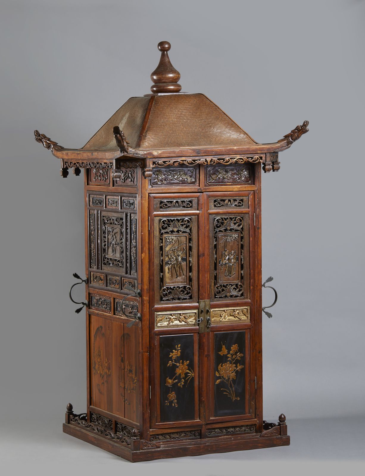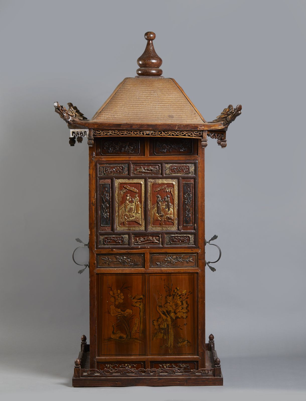Di forma rettangolare, sormontata da un tetto a pagoda in rete di bambù contornato da cornicione finemente intagliato a motivi vegetali e draghi. La parte frontale è caratterizzata da doppia porta le cui ante sono divise in quattro pannelli scolpiti e laccati. Tutti i fianchi riccamente decorati nella parte superiore con elaborati intagli di figure e simboli di buon auspicio, nella parte inferiore con pannelli laccati a motivi floreali. ai quattro spigoli sono applicate maniglie metalliche per l alloggio delle barre di trasporto rimovibili.