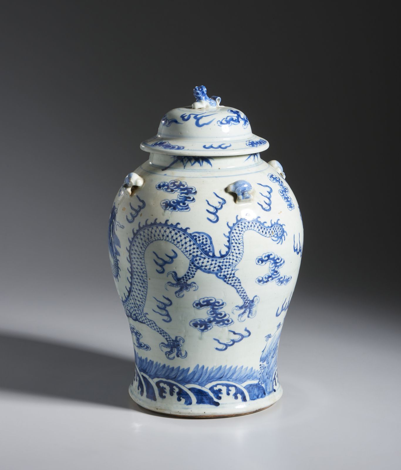 Il corpo del vaso a cui sono applicate quattro piccole prese a forma di teste leonine è decorato con draghi che volano tra le nuvole.