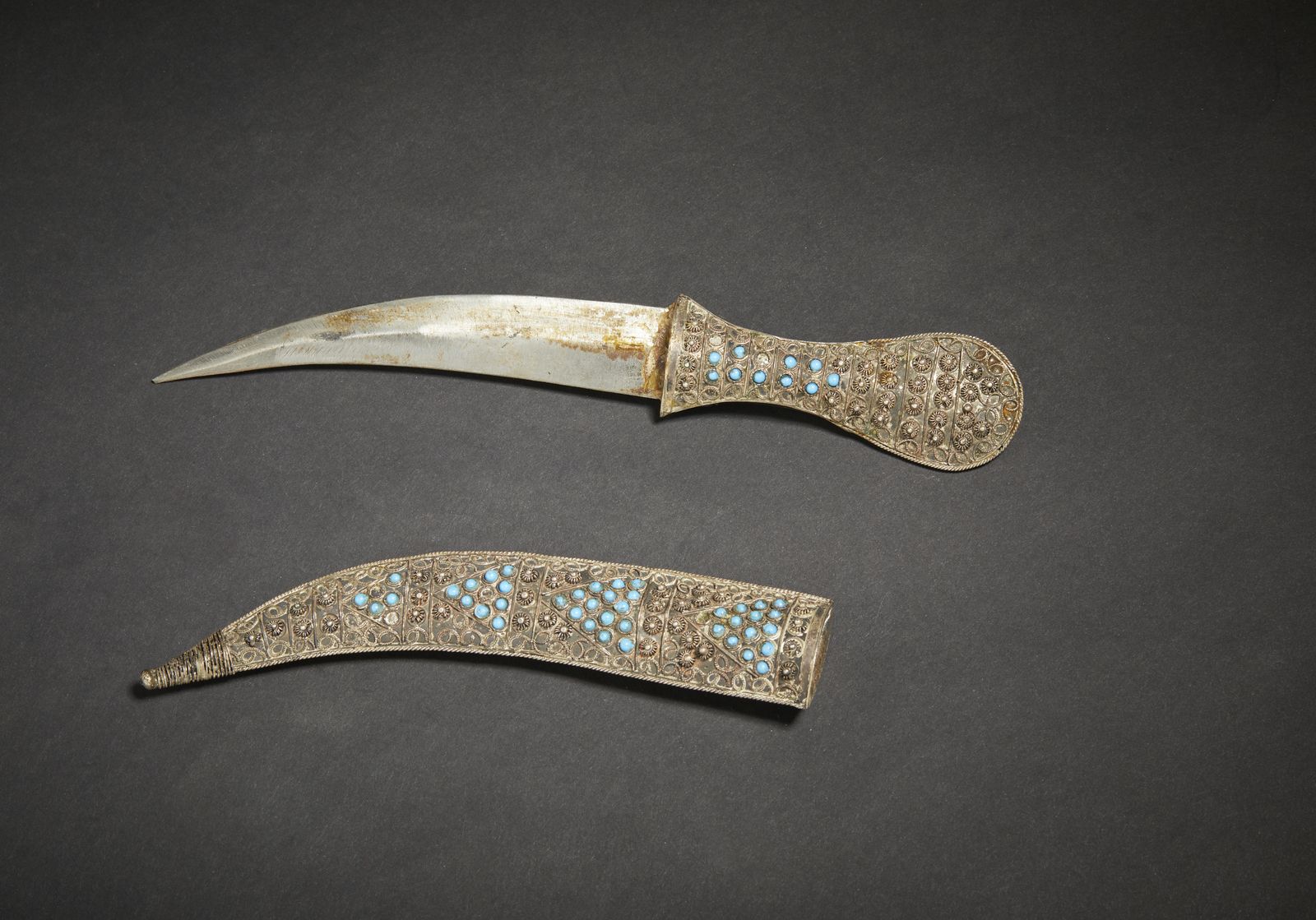 dalla lama ricurva con impugnatura in metallo ornato con castoni color turchese. Il fodero in metallo ripete la decorazione con cabochon turchesi dell'impugnatura.