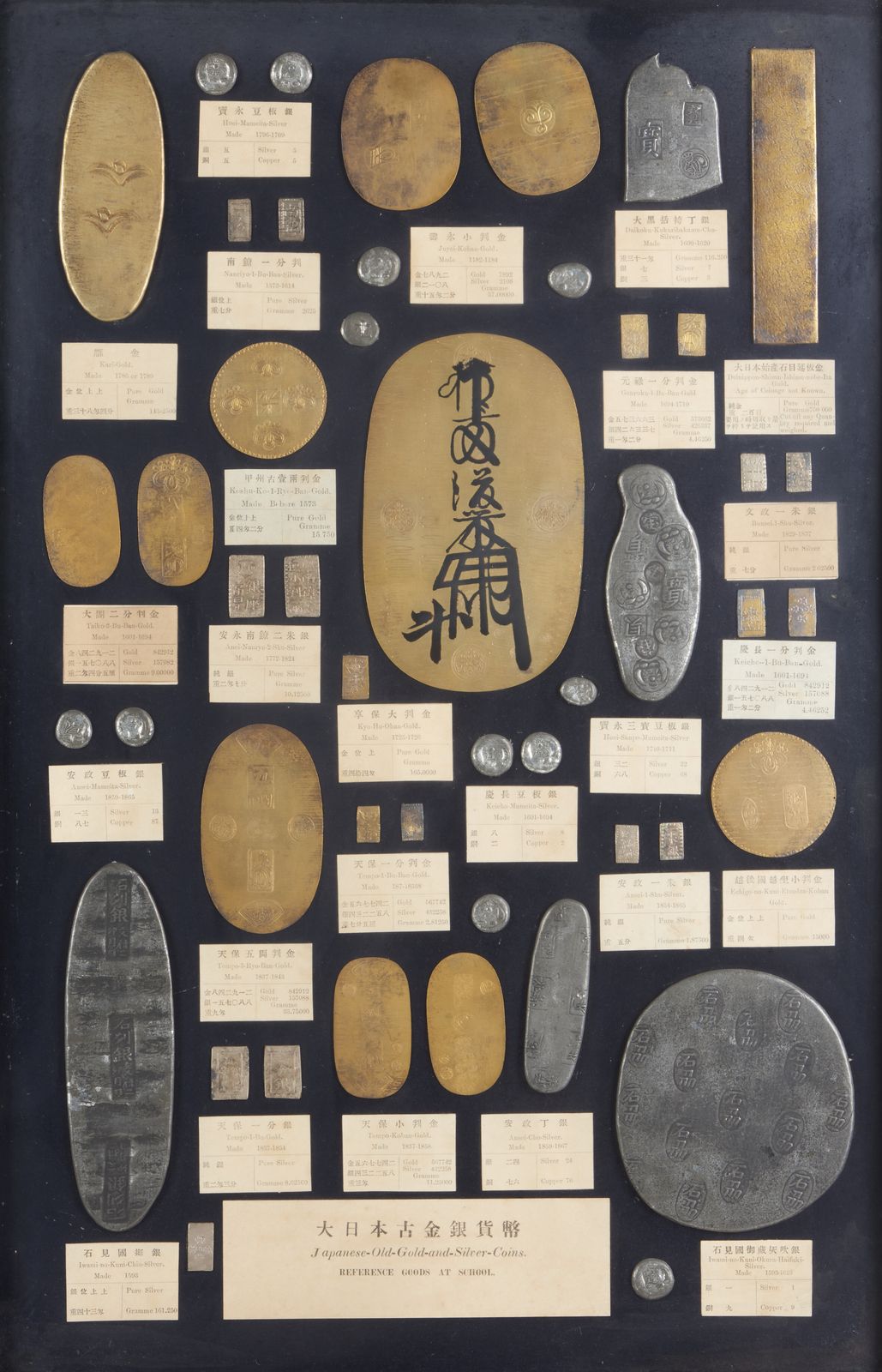 Contenute all'interno di una bacheca rettangolare. Ogni moneta è accompagnata da una piccola etichetta che indica il nome, il pezzo e la composizione dell'emissione sia in giapponese che in inglese. Collezioni di questo tipo realizzate con materiali che imitavano le leghe preziose furono create a fini turistici tra la fine dell'ottocento e i primi del novecento come testimonianza delle monete coniate nel periodo Edo.