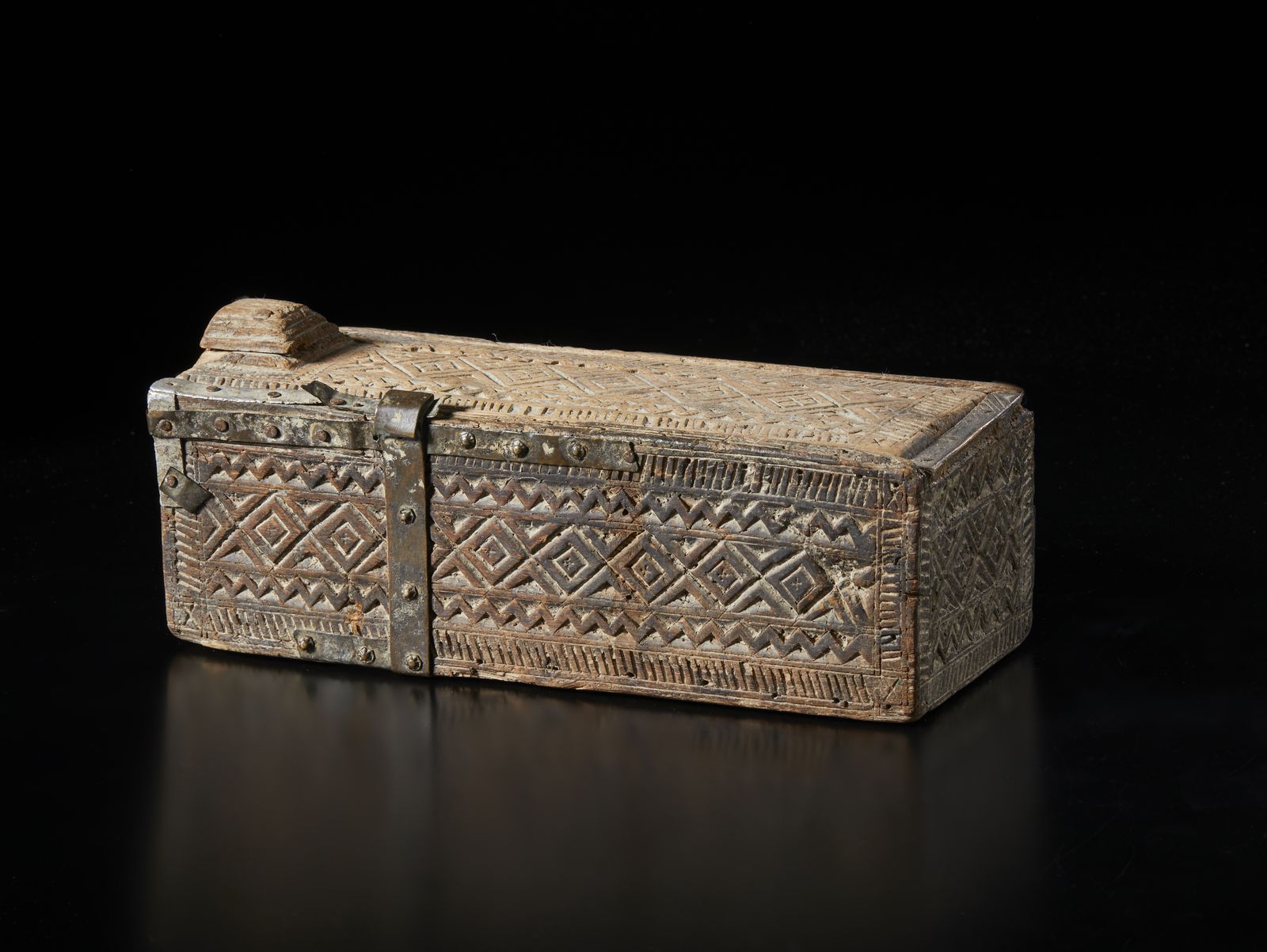 Di forma rettangolare, finemente intagliata con un elaborato disegno geometrico. Internamente il contenitore è diviso in tre scomparti, il coperchio è scorrevole.Provenienza: Collezione Berger.