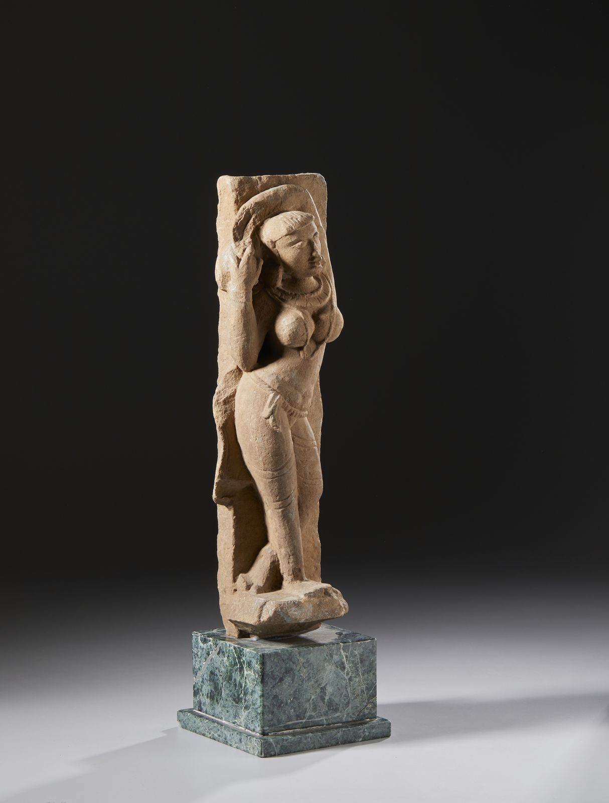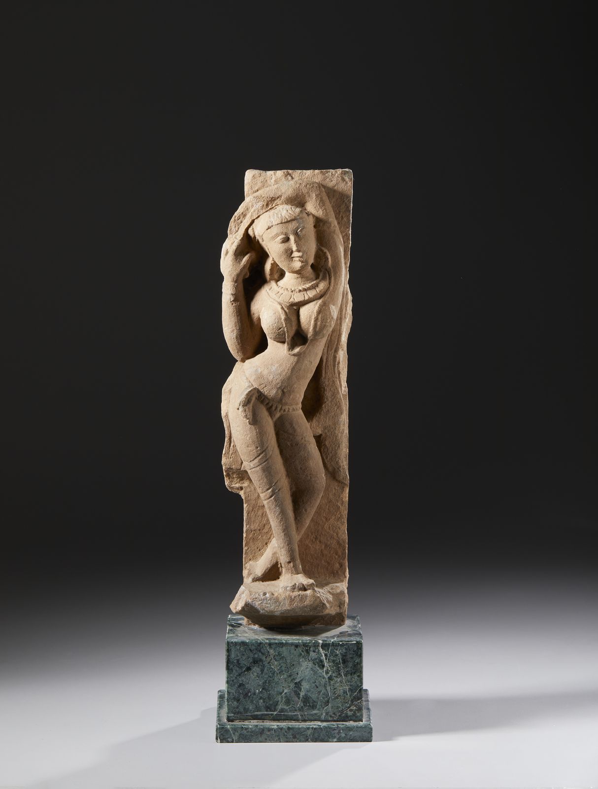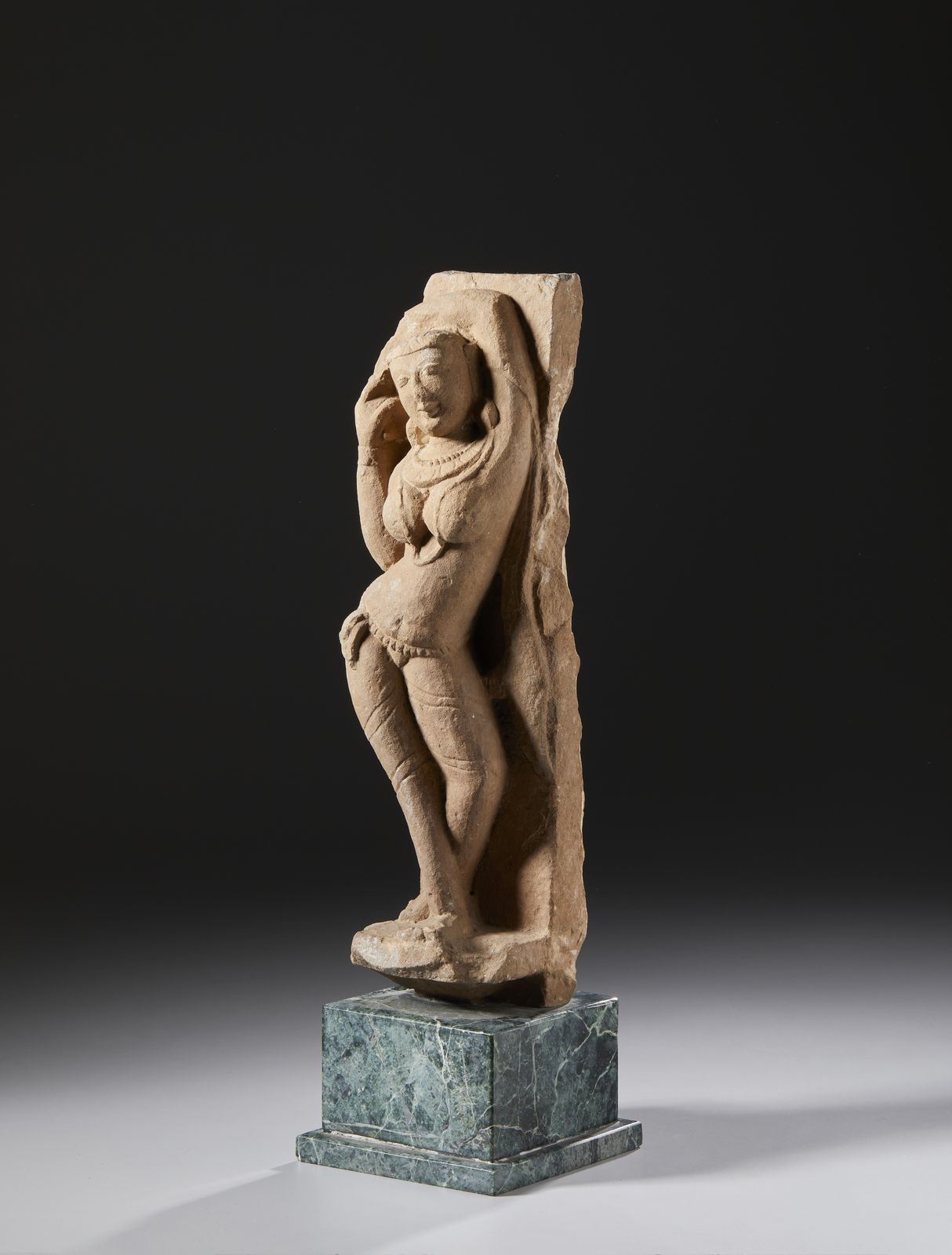 Scultura in arenaria rosa raffigurante Apsara. Probabilmente Periodo Candela.