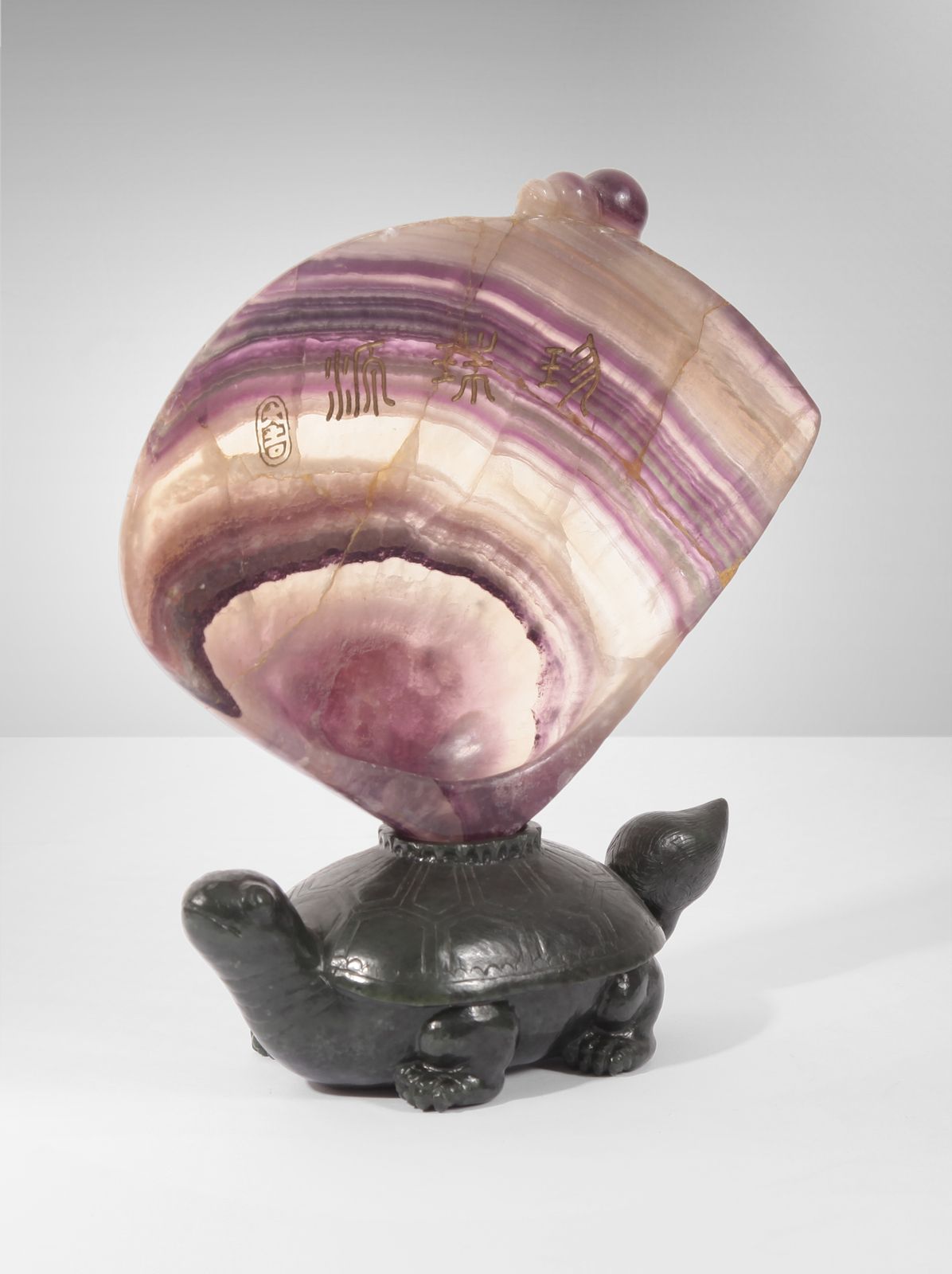 Scultura in giada e quarzo ametista raffigurante una tartaruga in giada verde spinacio [..]