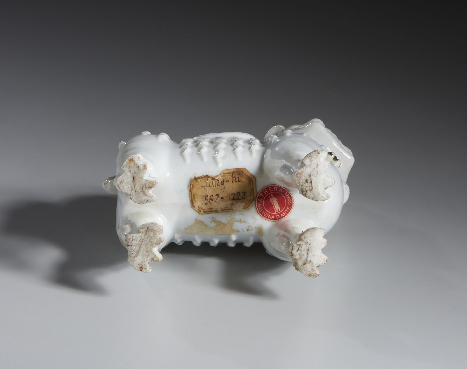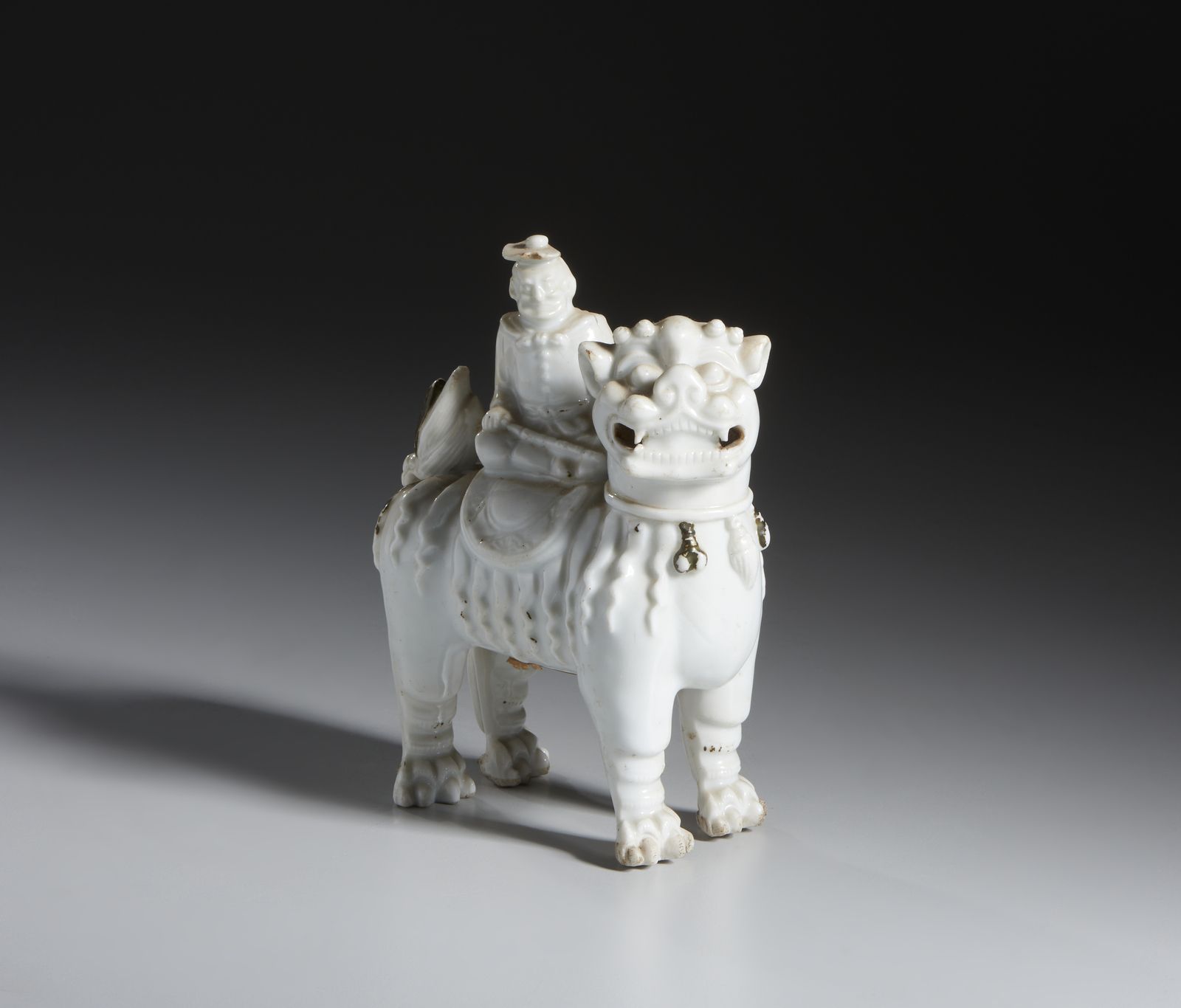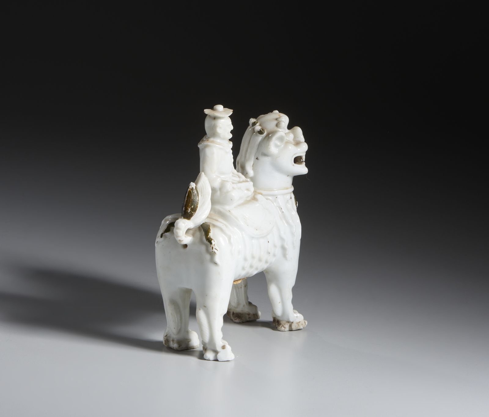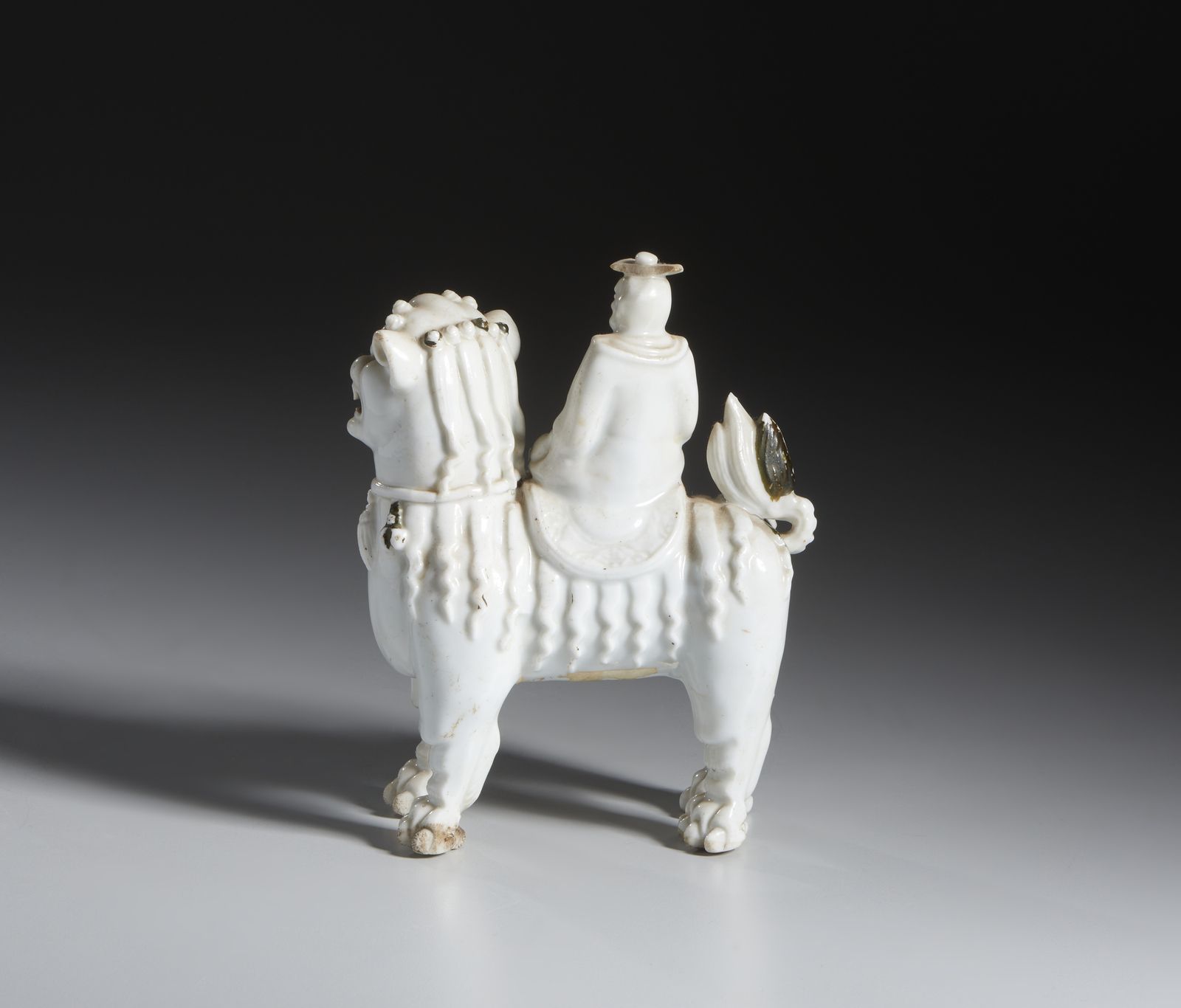 Scultura in porcellana dehua raffigurante un uomo a cavallo di un leone buddhista.Cina, [..]
