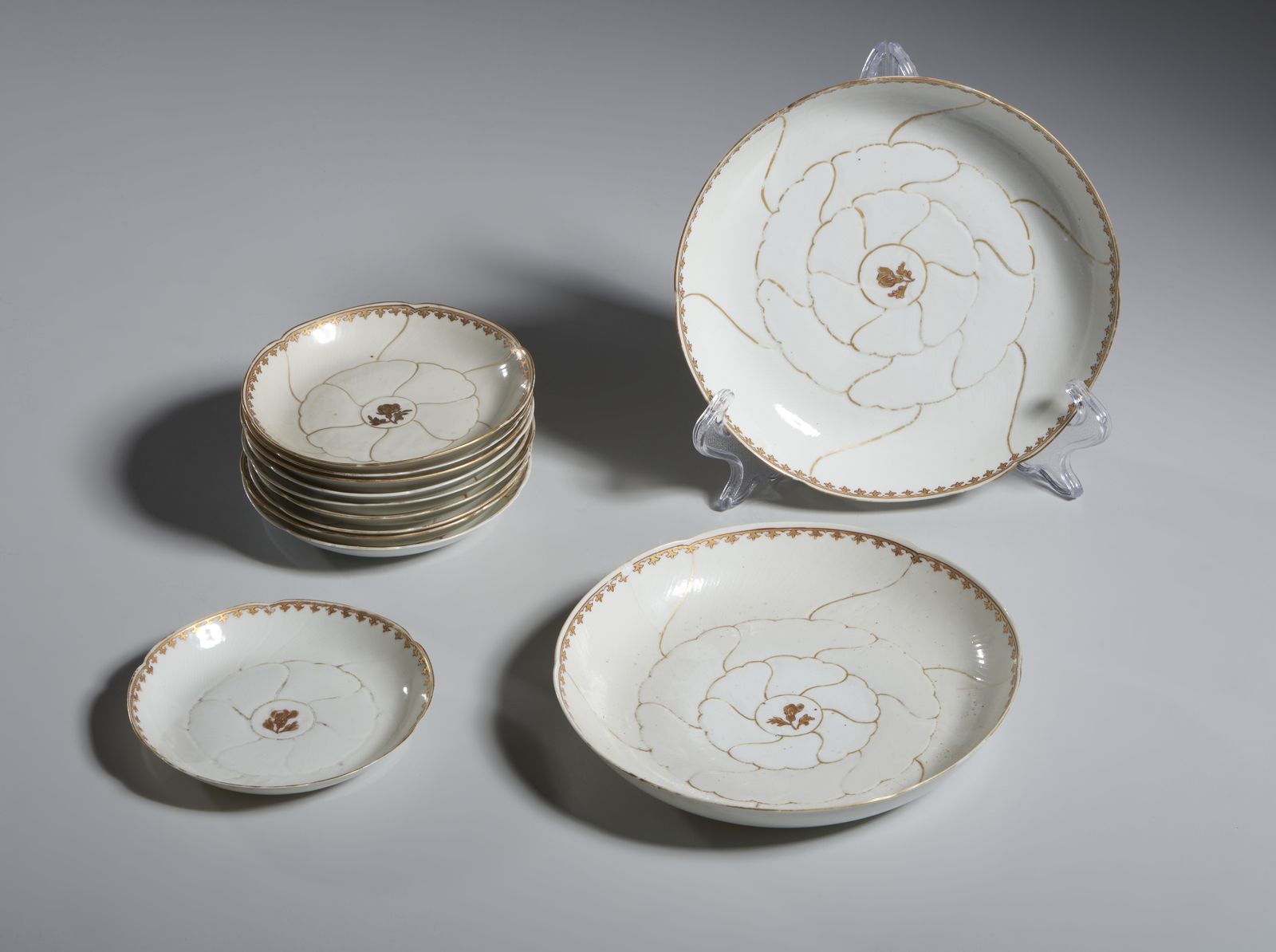 Composto da 1 teiera, 8 tazzine, 12 piattini, due piatti grandi e due piatti medi, due ciotole medie decorato con un raffinato disegno in rosso ferro ed oro a riserve concentriche a forma di petalo a formare una peonia. Al centro di ogni elemento un petalo in oro completa la decorazione.