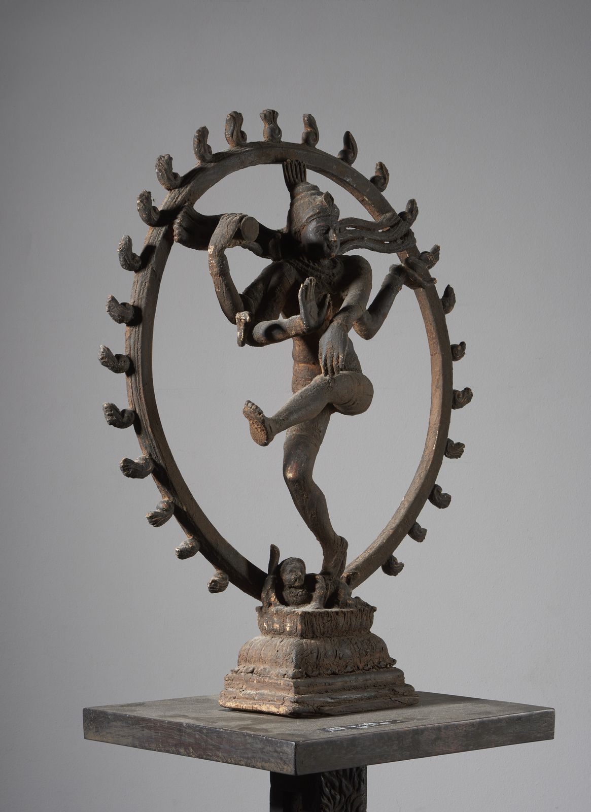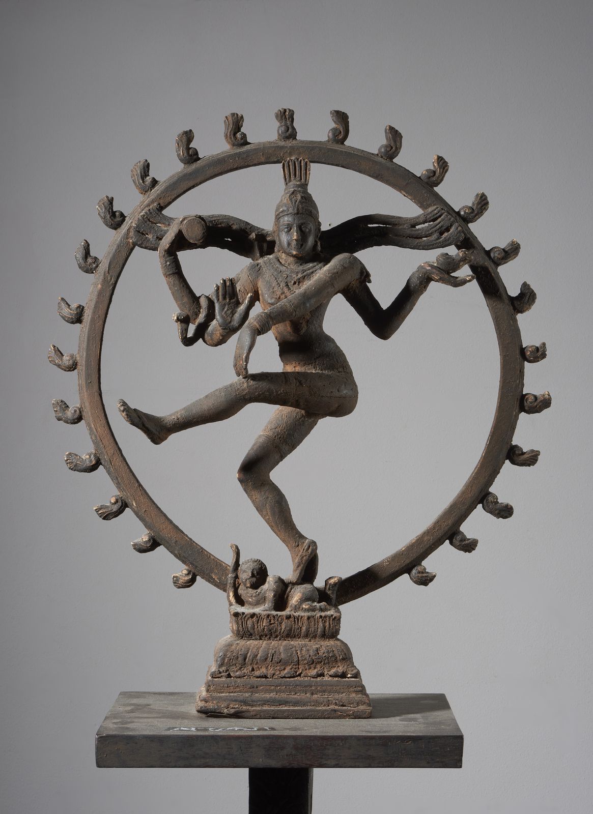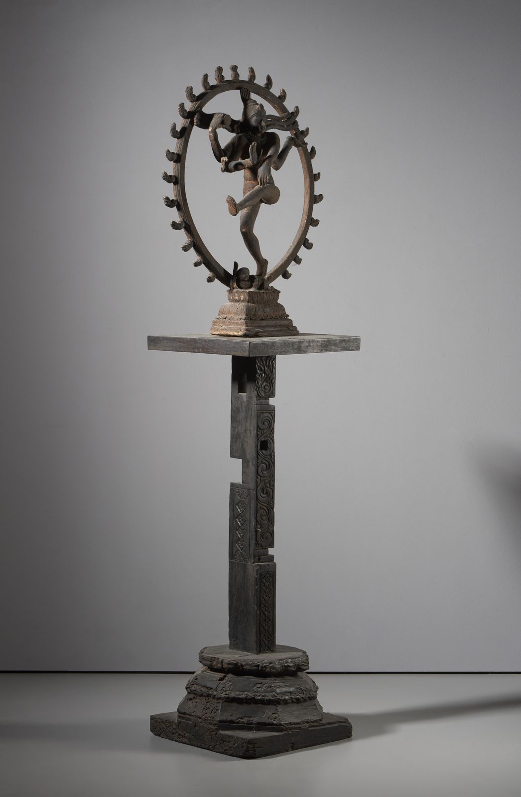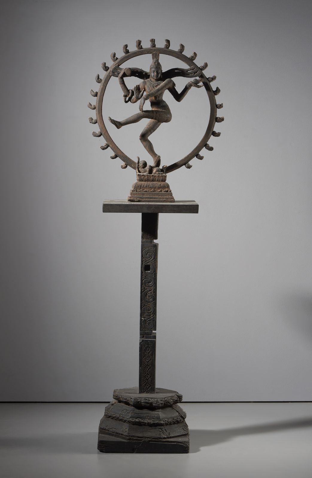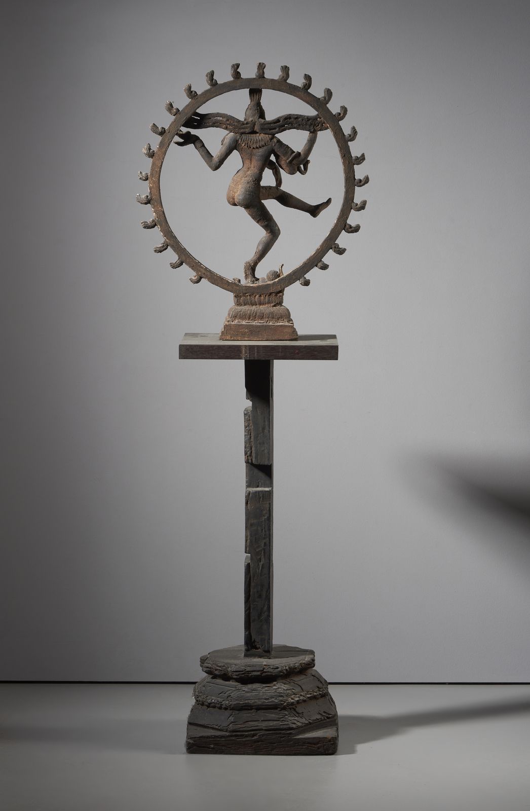 Shiva Nataraja danza poggiando il piede destro sul nano Apasmara Purusha (la personificazione dell'ignoranza) prostrato a terra su base di loto, la gamba sinistra è elegantemente sollevata. la figura è circondata da un’aureola di fiamme Prabhamandala che rappresenta l'infinito ciclo di nascita e morte. Base: 103x38 cm Provenienza: Collezione Berger.