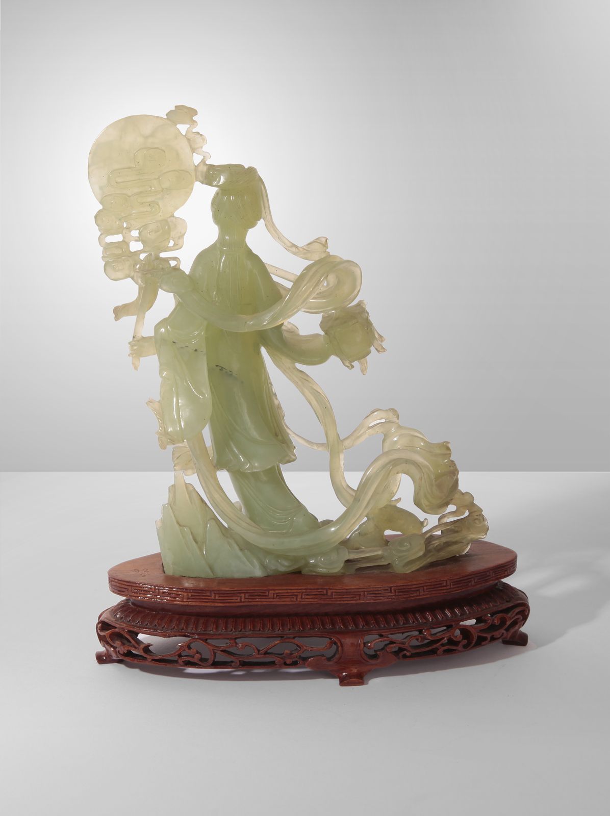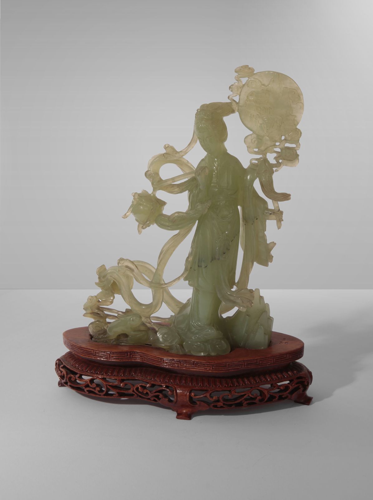 Statuetta di giovane fanciulla in serpentino verde.Cina, XX secolo.