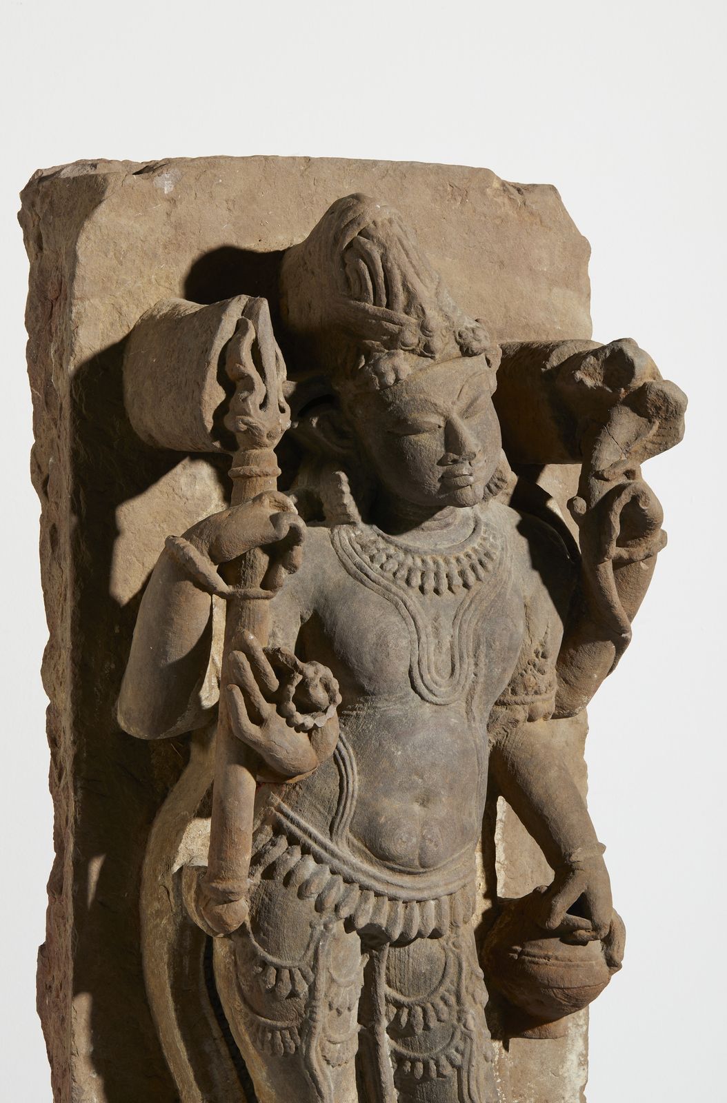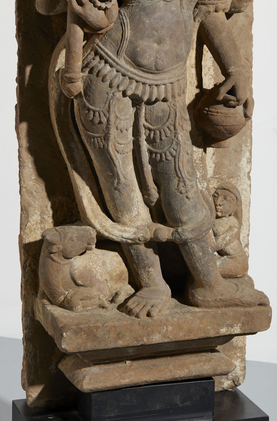 La stele di forma rettangolare è scolpita ad altorilievo con Shiva in piedi in tribhanga su di un piedistallo sobriamente sagomato, le mani in primo piano reggono akshamala e kalasha mentre quelle superiori trisula e naga. Il corpo sinuoso è coperto da un dhoti decorato con nappe e gioielli. Il viso dall'espressione soave è caratterizzato da grandi occhi a mandorla, i lobi delle orecchie allungati sorreggono grandi orecchini e il volto è incorniciato dalla bellissima acconciatura jatamakuta. Ai piedi della divinità il fedele toro e un devoto adoratore.Provenienza: Collezione privata italiana. Acquistata da Christie' s Amsterdam rif. Live Auction 2687, 18-Apr-2005 Lotto N° 48.