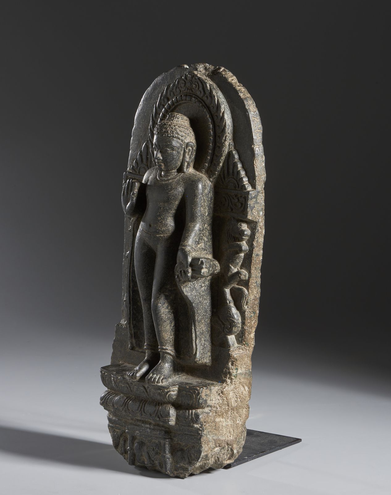 L’ immagine centrale del Buddha è raffigurata in posizione samabhanga mentre compie con la mano destra il gesto di allontanamento della paura. il ginocchio sinistro leggermente flesso in avanti indica ancora una volta uno slancio amorevole e soccorritore verso il fedele. La figura si poggia saldamente su di una base a doppio fiore di loto. Un diafano sanghati drappeggiato su entrambe le spalle rivela i morbidi contorni del suo corpo.Una grande aureola gli circonda il capo. è costituita da una fila di grandi perle e da fiammelle a forma di riccioli impreziositi dai due gioielli fiammeggianti disposti sullo schienale del trono ai lati del Buddha. La struttura dello schienale così decorato e sorretto da elefanti e leoni sono elementi tipici dell arte prodotta in Bihar durante la dinastia Pala.Provenienza: Collezione privata italiana. Acquistato da Capriacquar India & Himalaian works of art, Pescara, 20 novembre 2013.