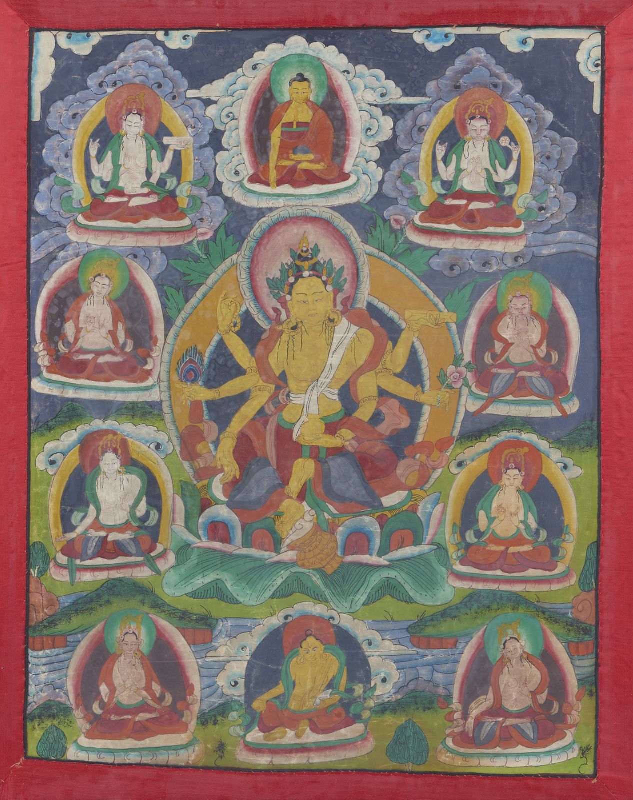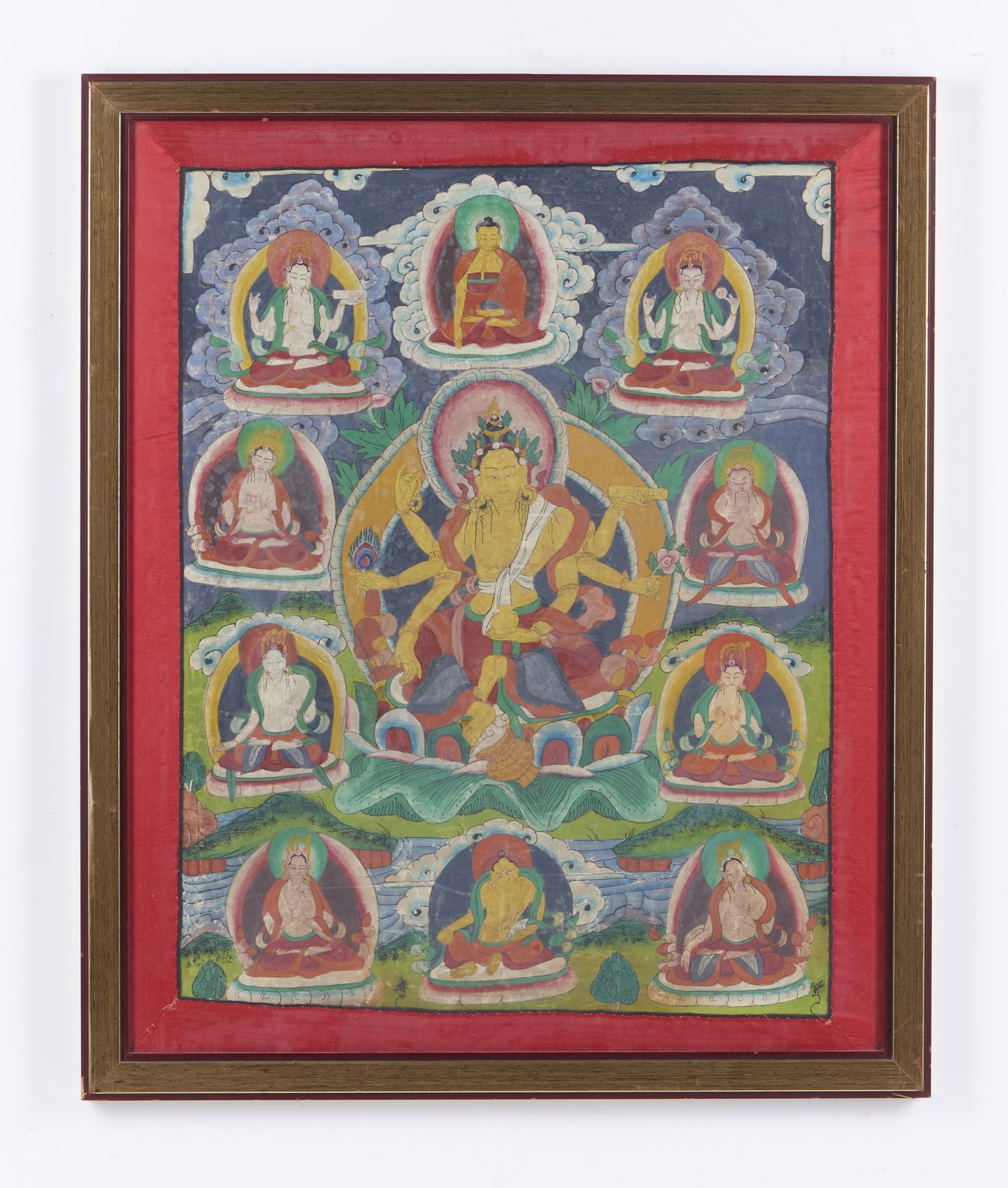 Tangka in tessuto raffigurante al centro la Dea Vasudhara seduta su un loto contornata [..]