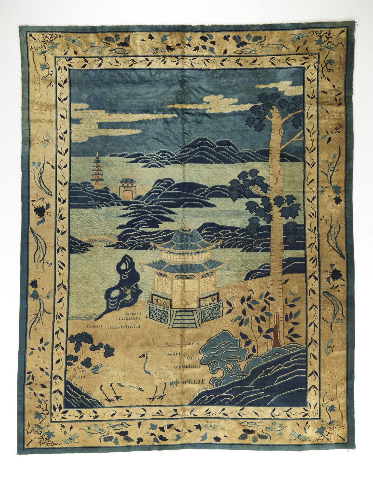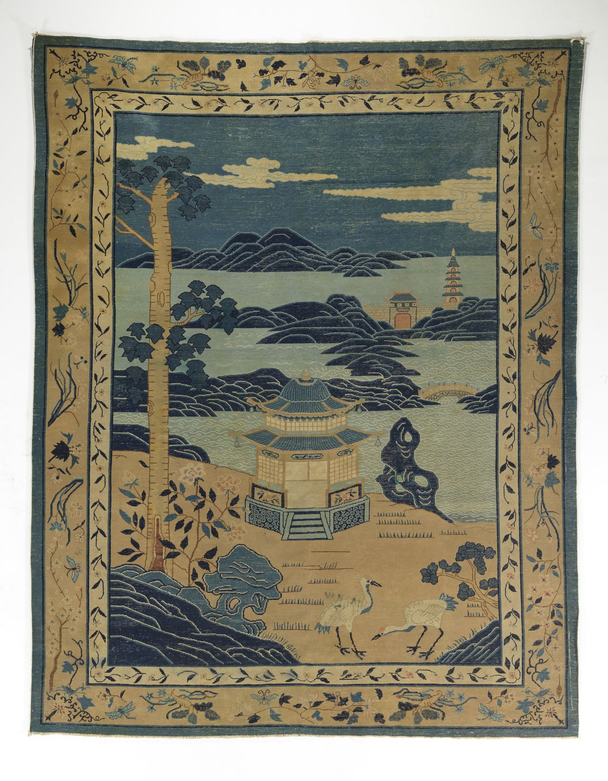 Trama e ordito in cotone, vello in lane seriche di alta qualità, raffigurante uno scorcio paesaggistico in tipico stile Cina, con due gru in primo piano. Sullo sfondo una pagoda alle spalle della quale si apre un paesaggio con acqua e rocce che donano profondità alla raffigurazione. Nodo fine e alta qualità nella tecnica di annodatura permettono un disegno nitido e preciso. Il manufatto si presenta morbido e in buone condizioni di conservazione considerando l'età, alcuni segni di usura e corrosione nei colori marroni (indice di epoca superiore ai 100 anni), completo di testate e bordure.