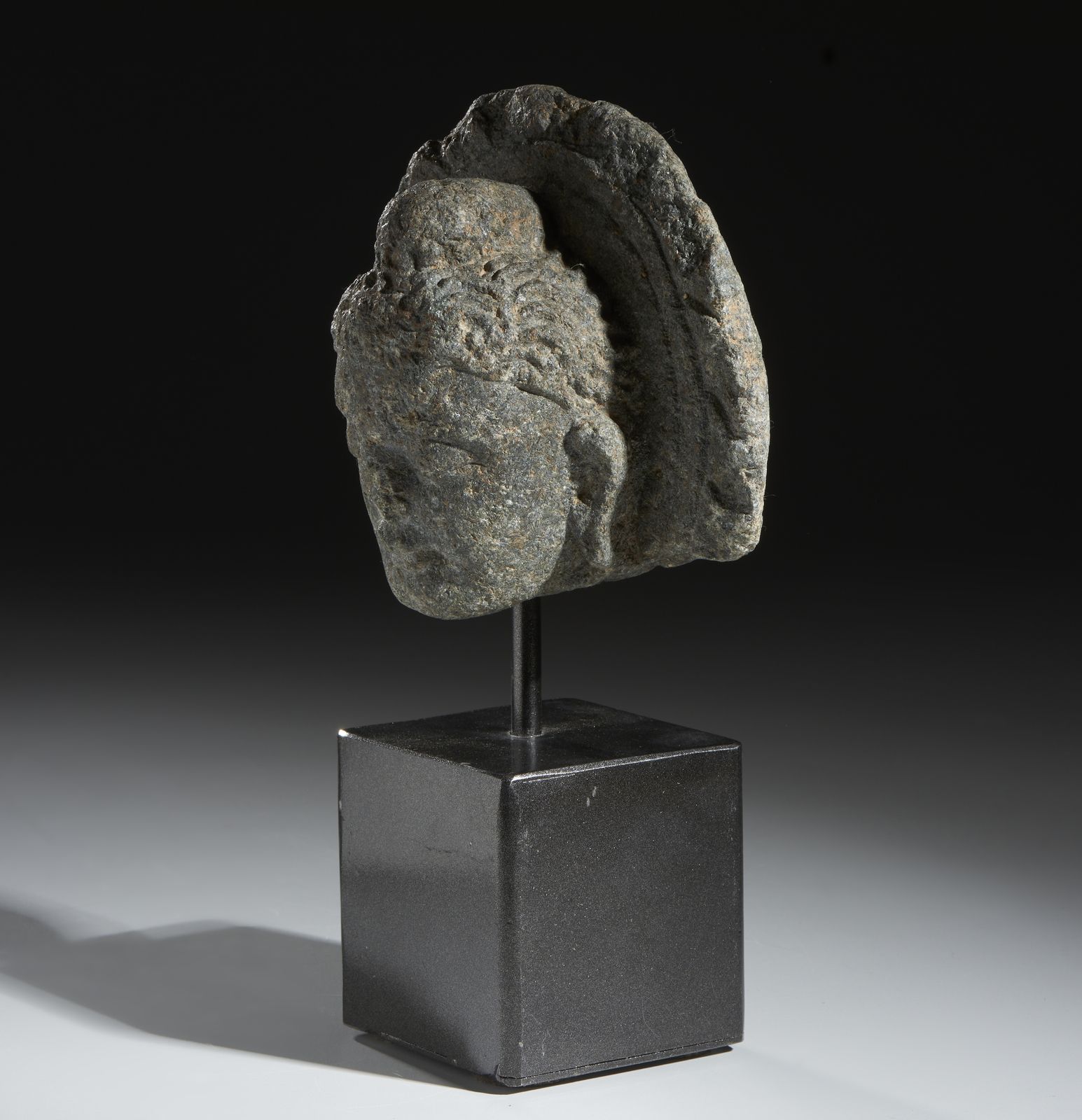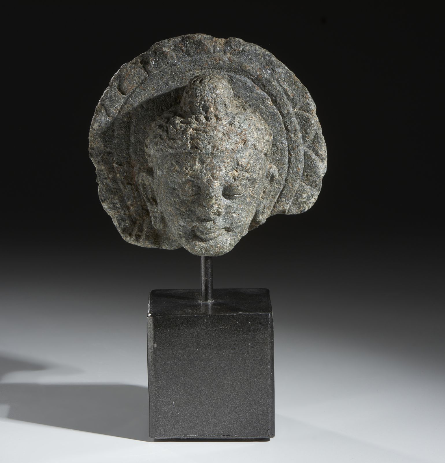 Il volto del Buddha incorniciato da una grande aureola ha occhi a mandorla, labbra carnose che accennano ad un etereo sorriso.Provenienza: collezione privata italiana.