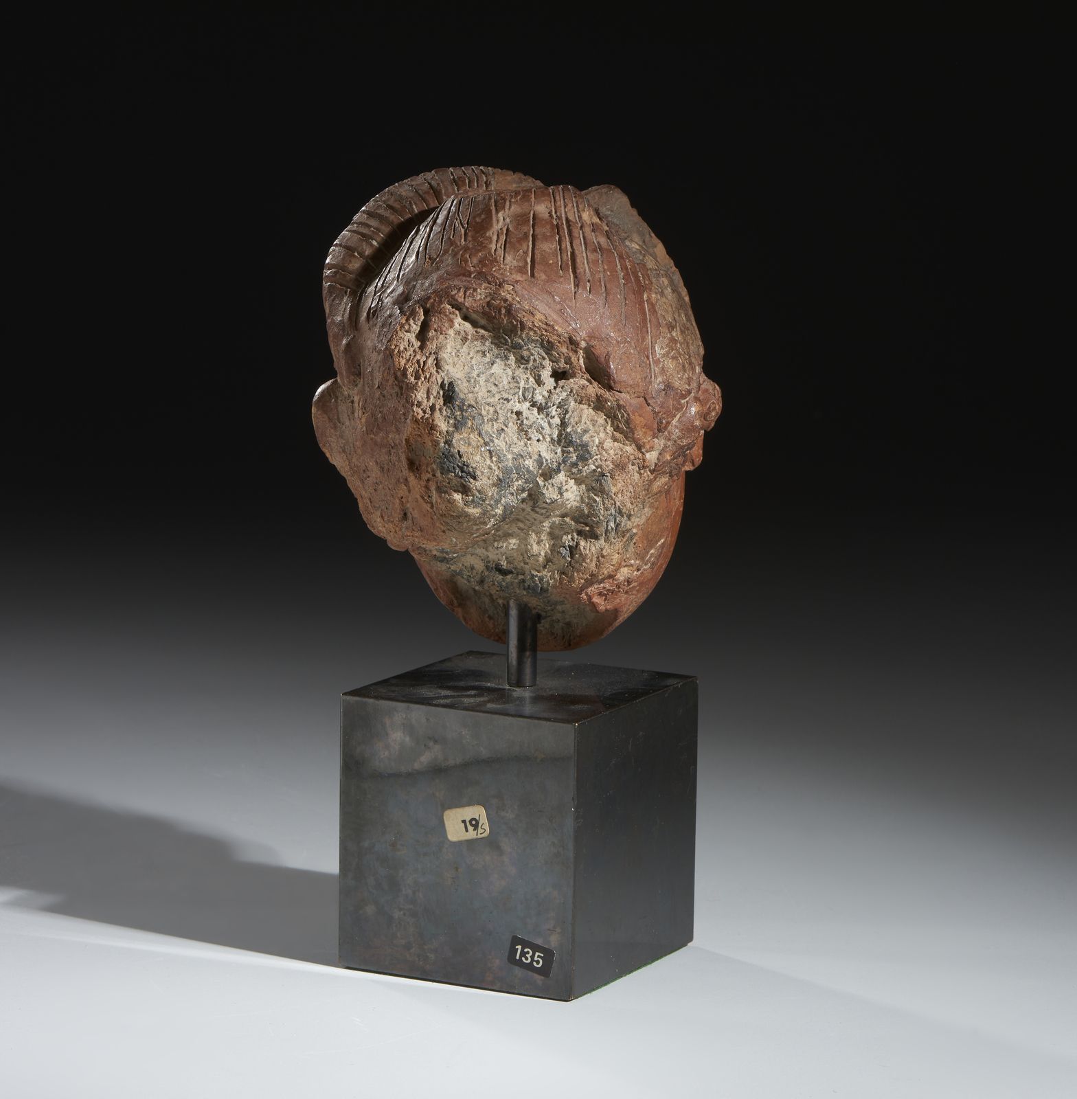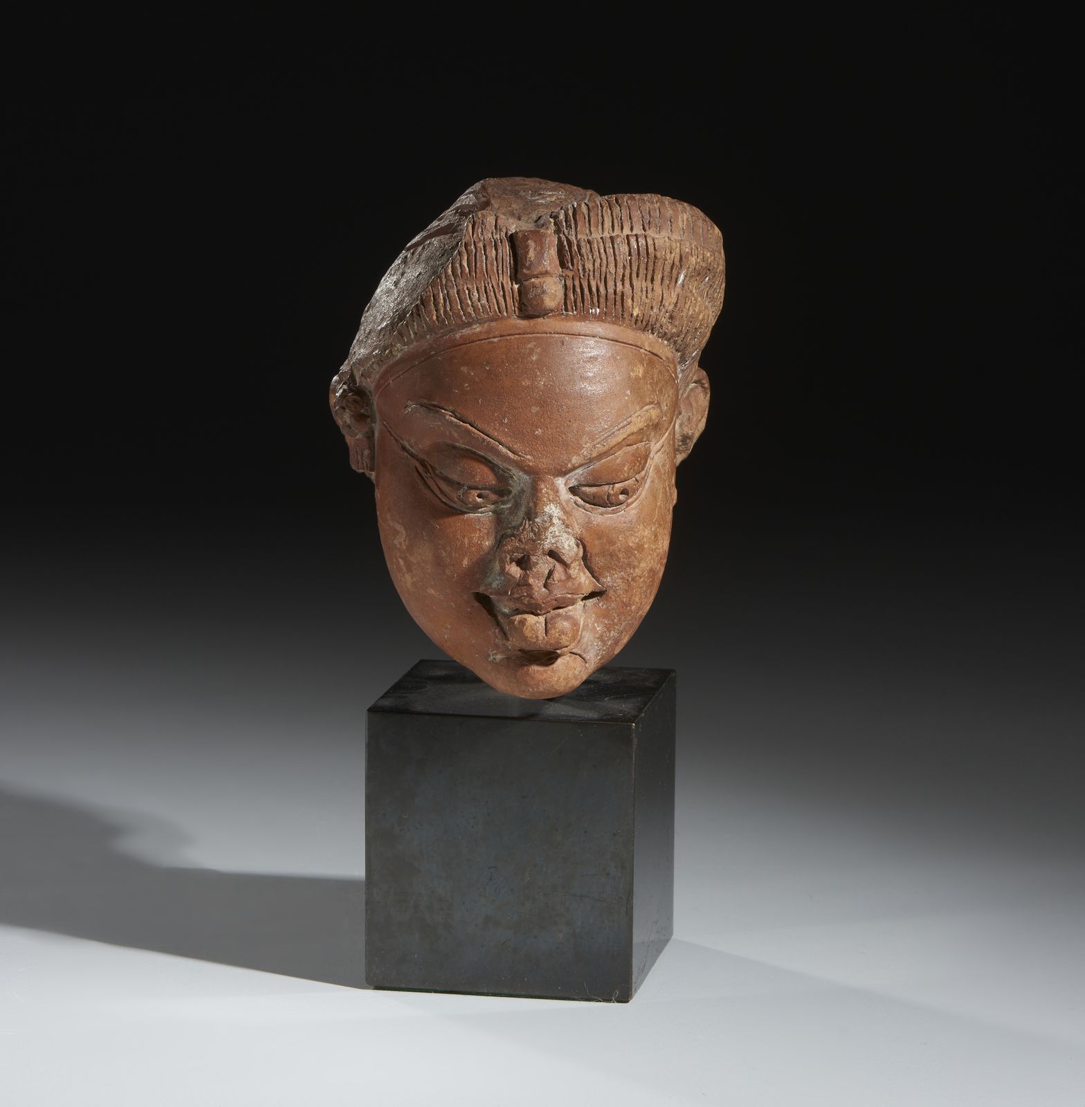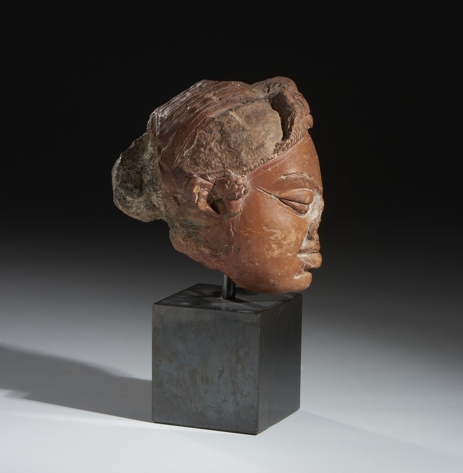Interessante testa tipica della grande dinastia Gupta. Realizzata in terracotta rossa , la scultura illustra perfettamente lo stile di questo periodo. Il viso è pieno, le sopracciglia fortemente arcuate, gli occhi molto larghi e prominenti con palpebre orlate. La bocca è carnosa e ben definita con gli angoli delle labbra scavati che abbozzano un sorriso.Provenienza: Collezione privata Italiana.