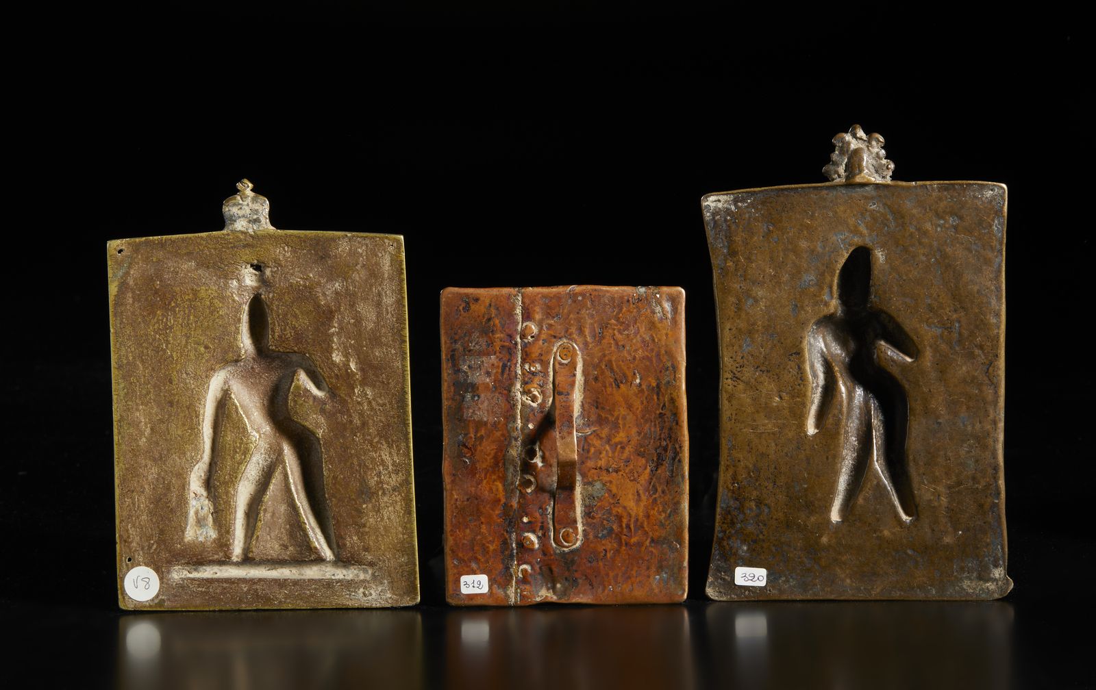 Tre placche rituali raffiguranti Shiva guerriero secondo la tradizionale iconografia.La misura riportata fa riferimento all'oggetto più grande.Provenienza: Collezione Berger.