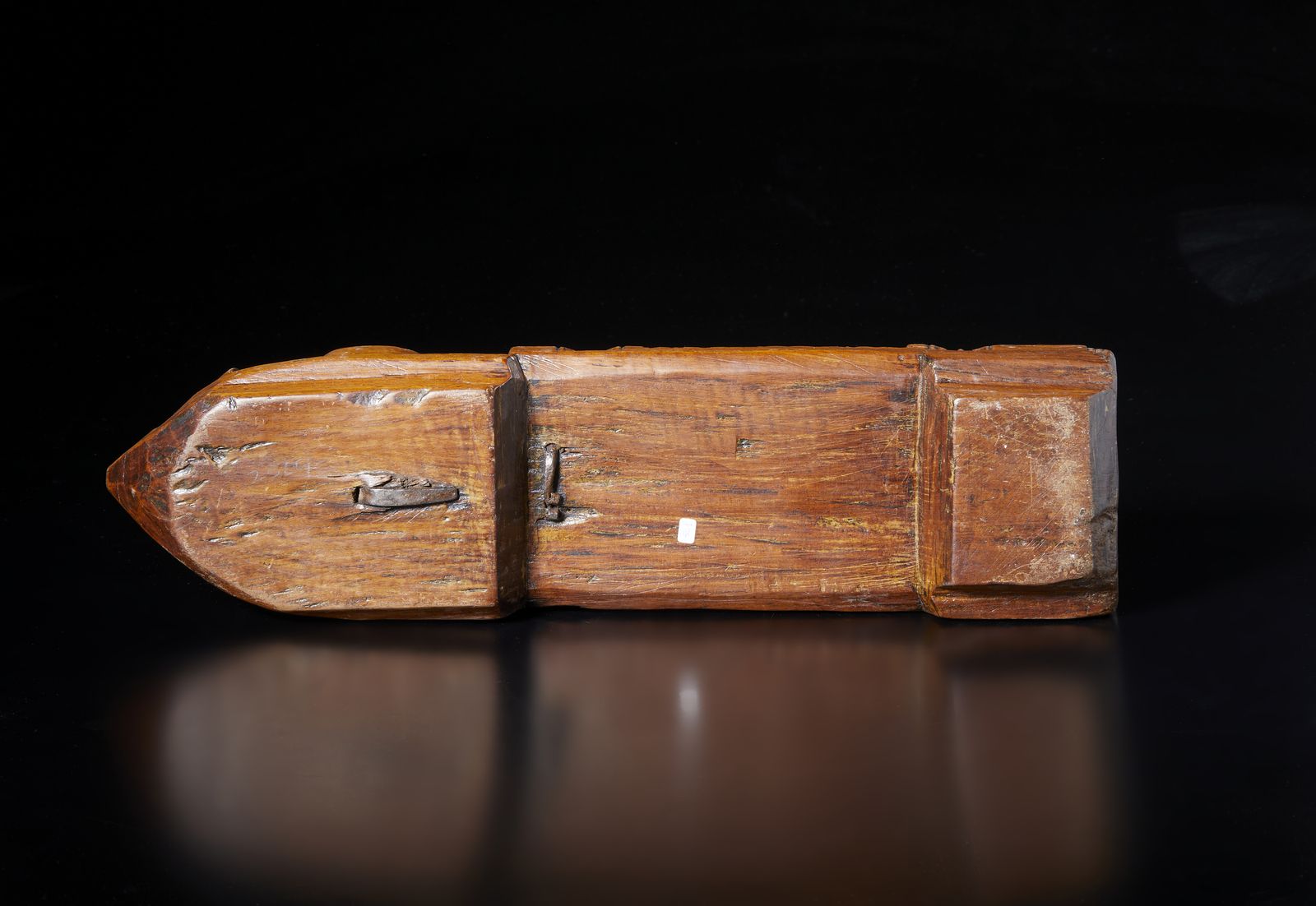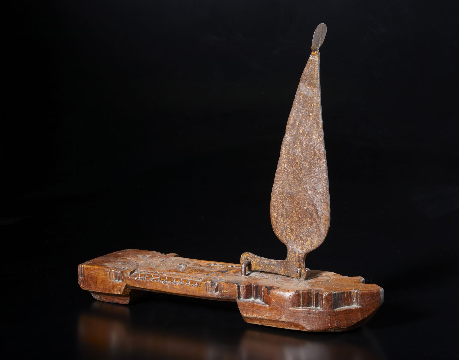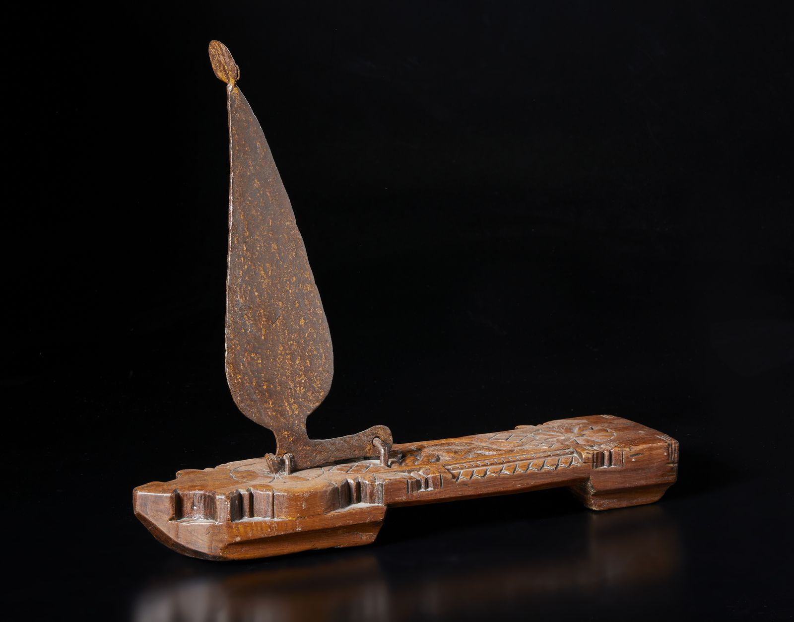 con base in legno e caratteristica grande lama in metallo tradizionalmente usato per il taglio di noci di cocco o verdure e tuberi di grandi dimensioni.Provenienza: Collezione Berger.