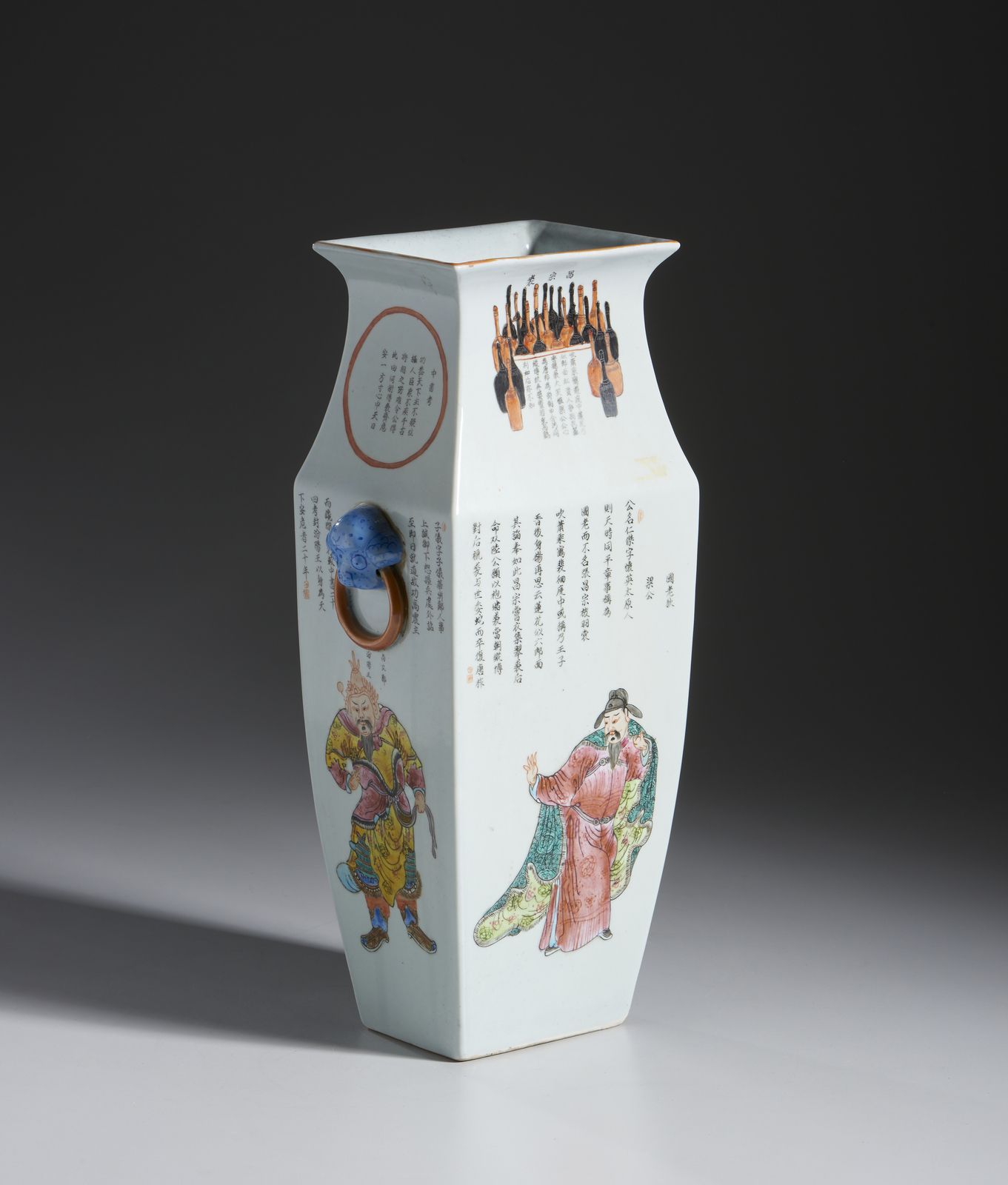 Pianta quadrata. dipinto nei colori della famiglia rosa con figure di immortali e iscrizioni entro riserve nel tipico stile wu shuang pu. Manici a forma di teste leonine.