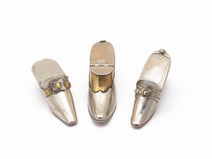 Tre tabacchiere in metallo a foggia di scarpette, inizio del XX secolo